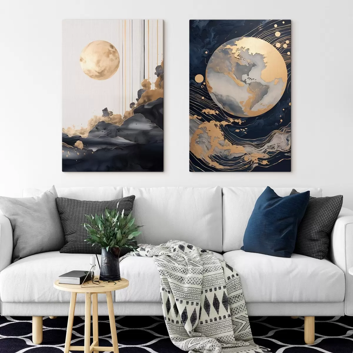 Schilderijen Textuurdecoratieve planeet in de ruimte met gele lijnen en stippen, abstracte stijl, minimalistisch en modern m01014