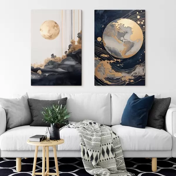Schilderij Textuurdecoratieve planeet in de ruimte met gele lijnen en stippen, abstracte stijl, minimalistisch en modern Art. m01014