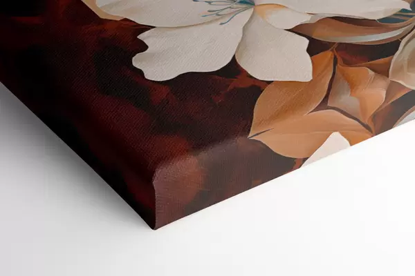 Schilderijen Abstracte witte bloemen en bladeren tegen een achtergrond van bruin en blauw met abstracte vormen, in een minimalistische stijl m01015