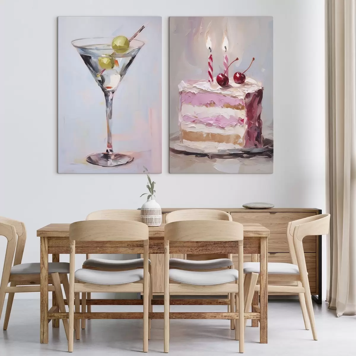 Schilderij Een glas met een drankje en een stuk taart imitatie schilderij Art. m01019