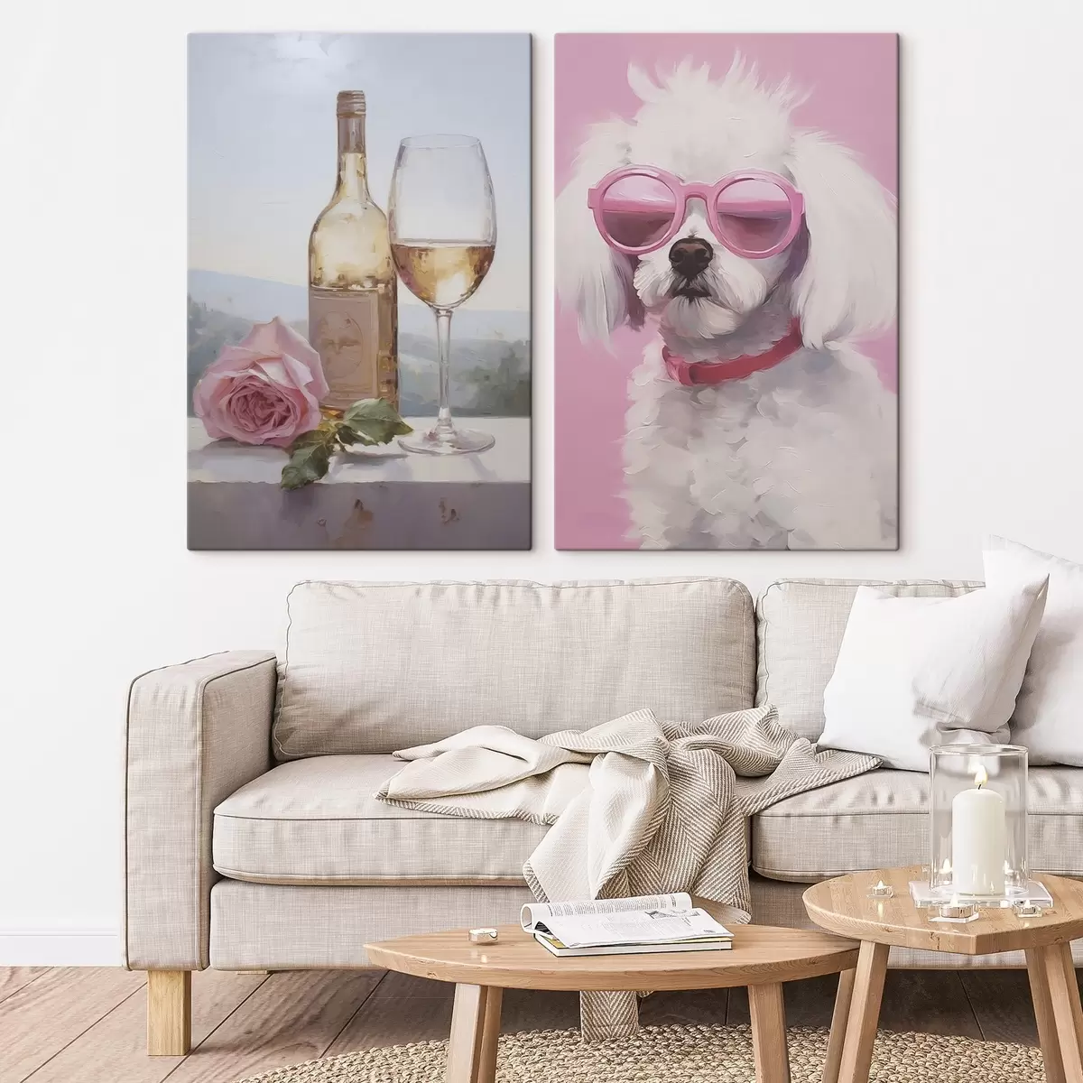 Schilderijen Een fles en een glas wijn en een poedel met een bril, imitatie schilderij m01021
