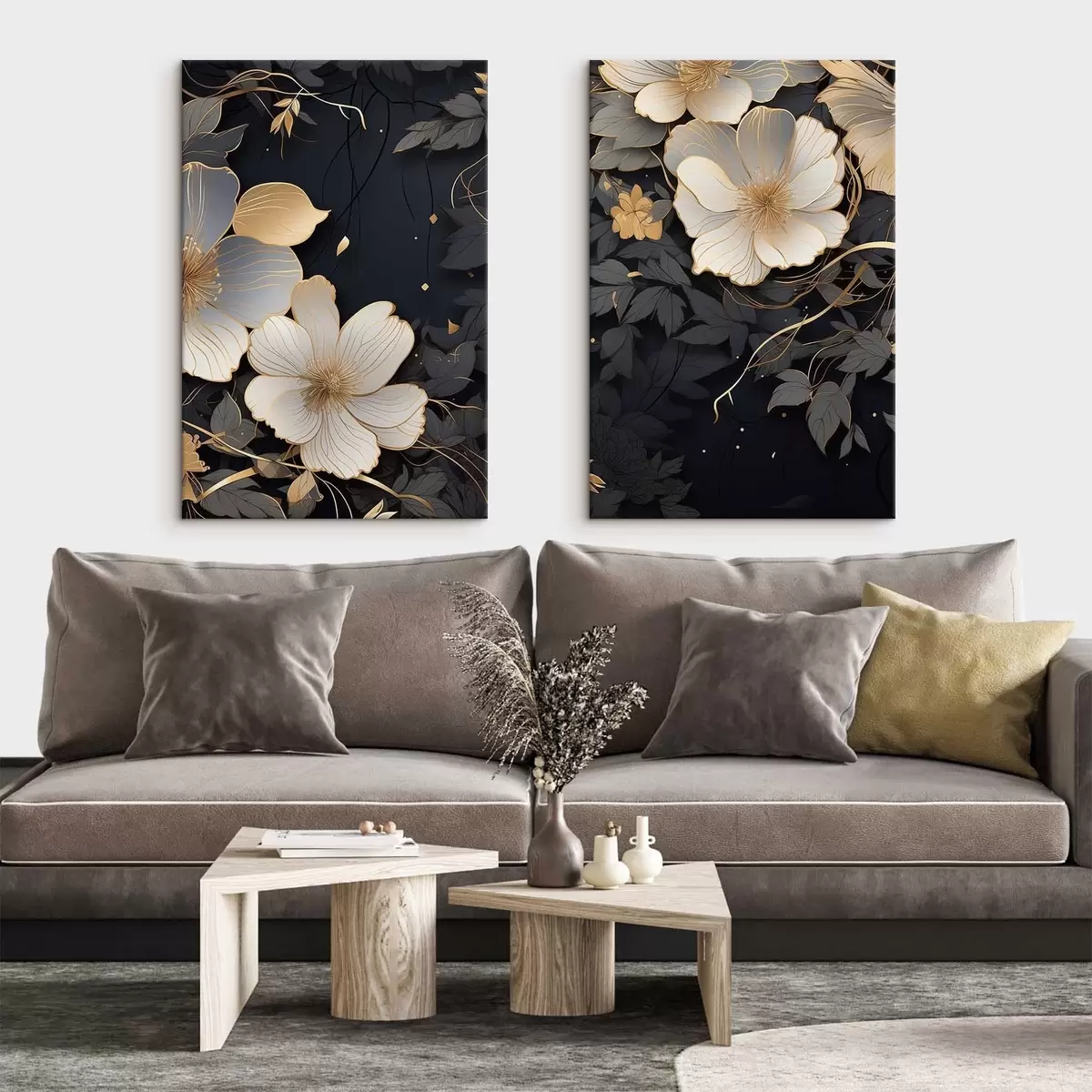 Schilderijen Grote abstracte bloemen op een donkere achtergrond m01066