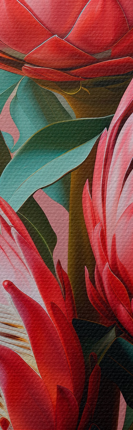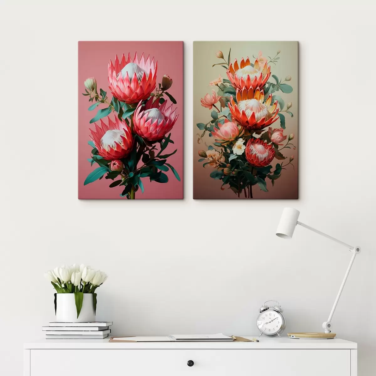 Schilderijen Proteas in twee stemmingen: rijke roze achtergrond en een warm olijfgroen kleurverloop m01092
