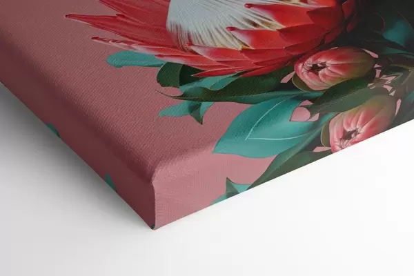 Schilderij Proteas in twee stemmingen: rijke roze achtergrond en een warm olijfgroen kleurverloop Art. m01092