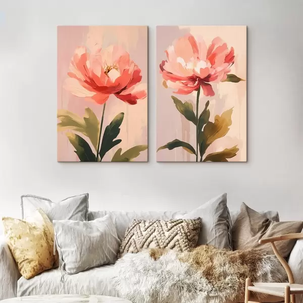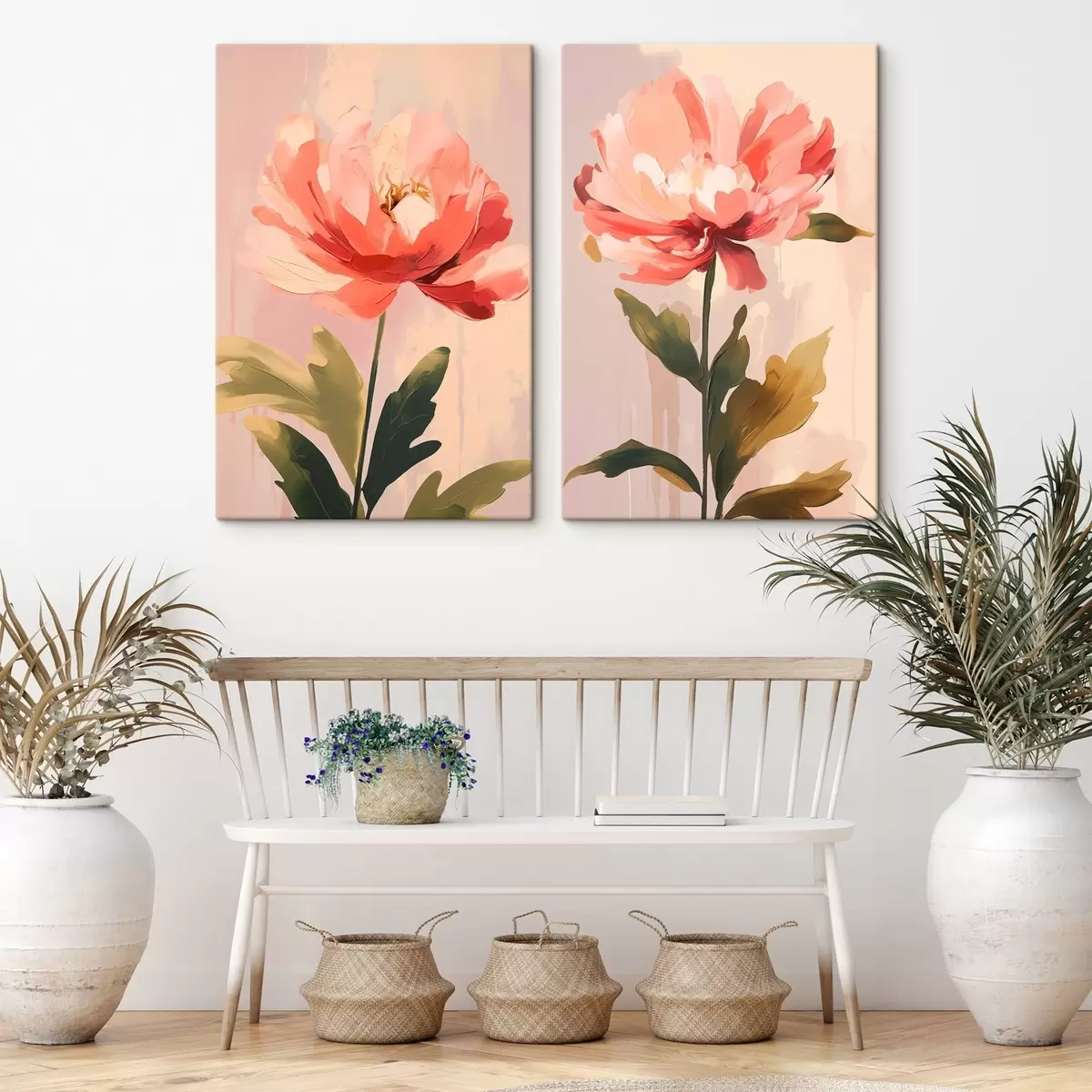 Schilderijen Pastelkleurige pioenrozen op lange stelen in warme roze tinten m01093