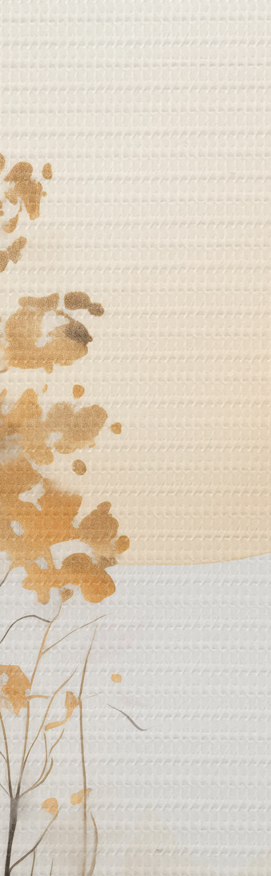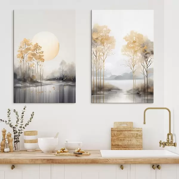 Schilderij Decoratief abstract landschap, hoge bomen met gele bladeren, een rivier en mist op de achtergrond Art. m01115