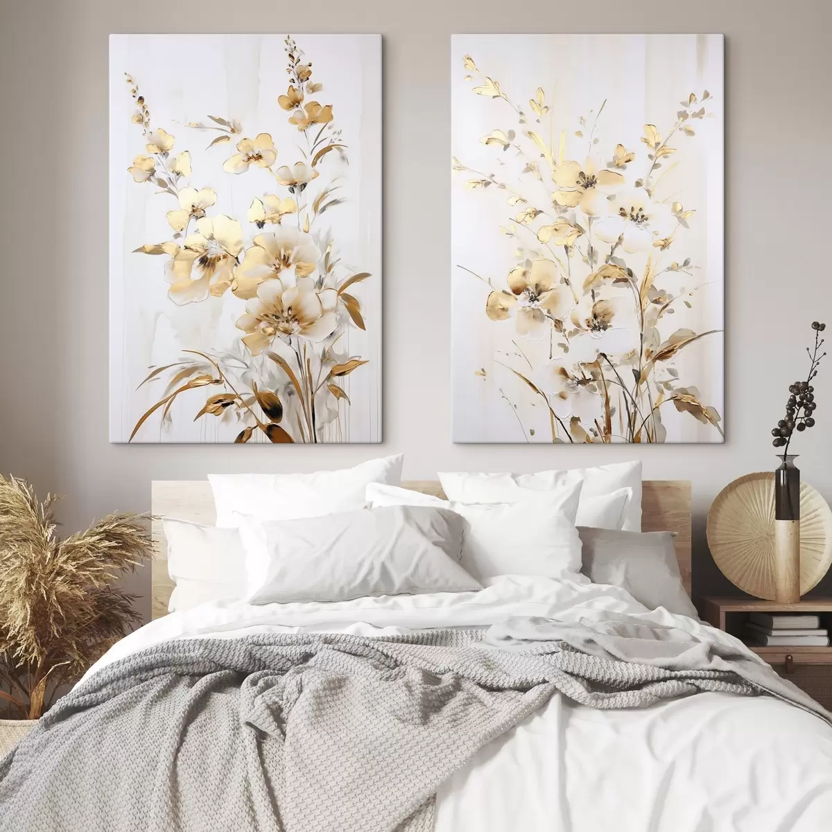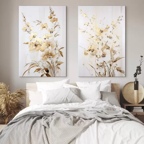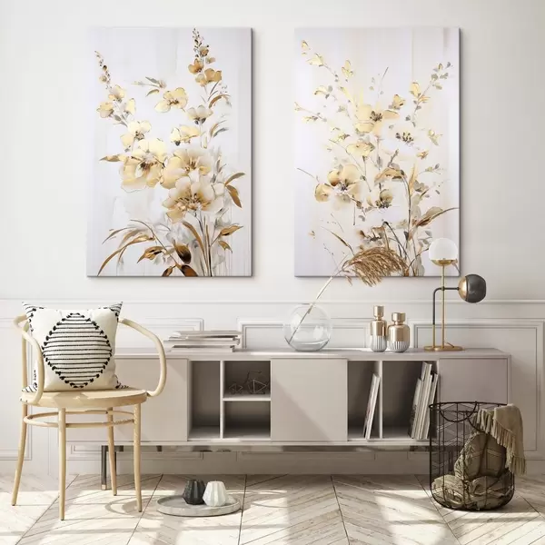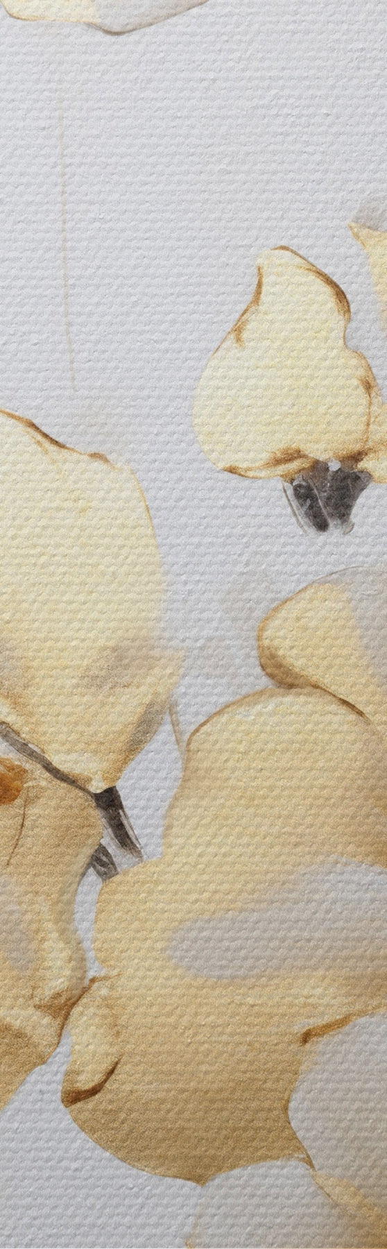 Schilderij Getextureerde gele bloemen en bladeren tegen een witte achtergrond, met delicate penseelstreken Art. m01116