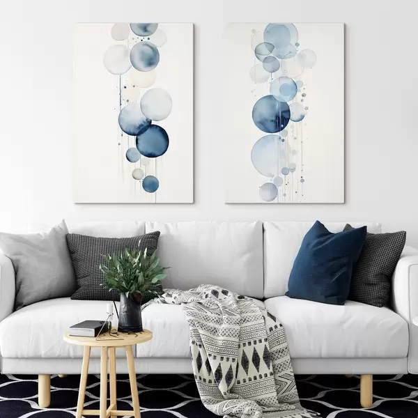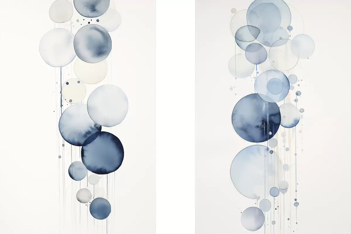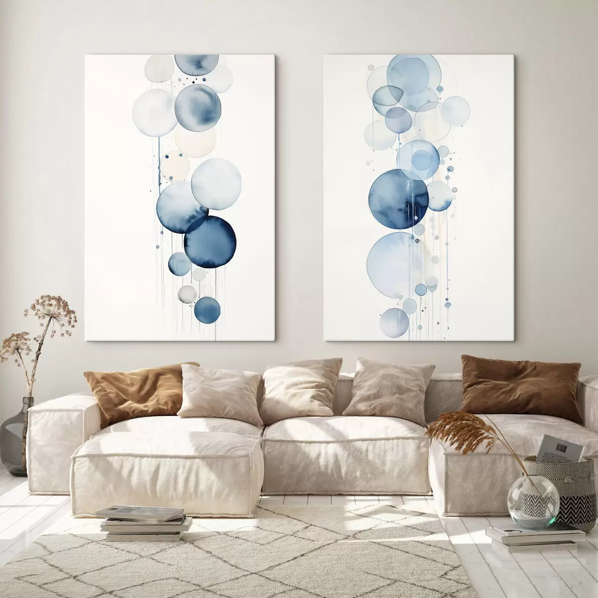 Schilderij Abstracte blauwe en witte waterverfcirkels met verschillende afmetingen en textuur, tegen een witte achtergrond Art. m01118