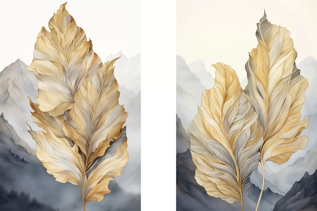 Schilderijen Abstracte grote, gele en bruine bladeren met ingewikkelde details, tegen een berglandschap m01119