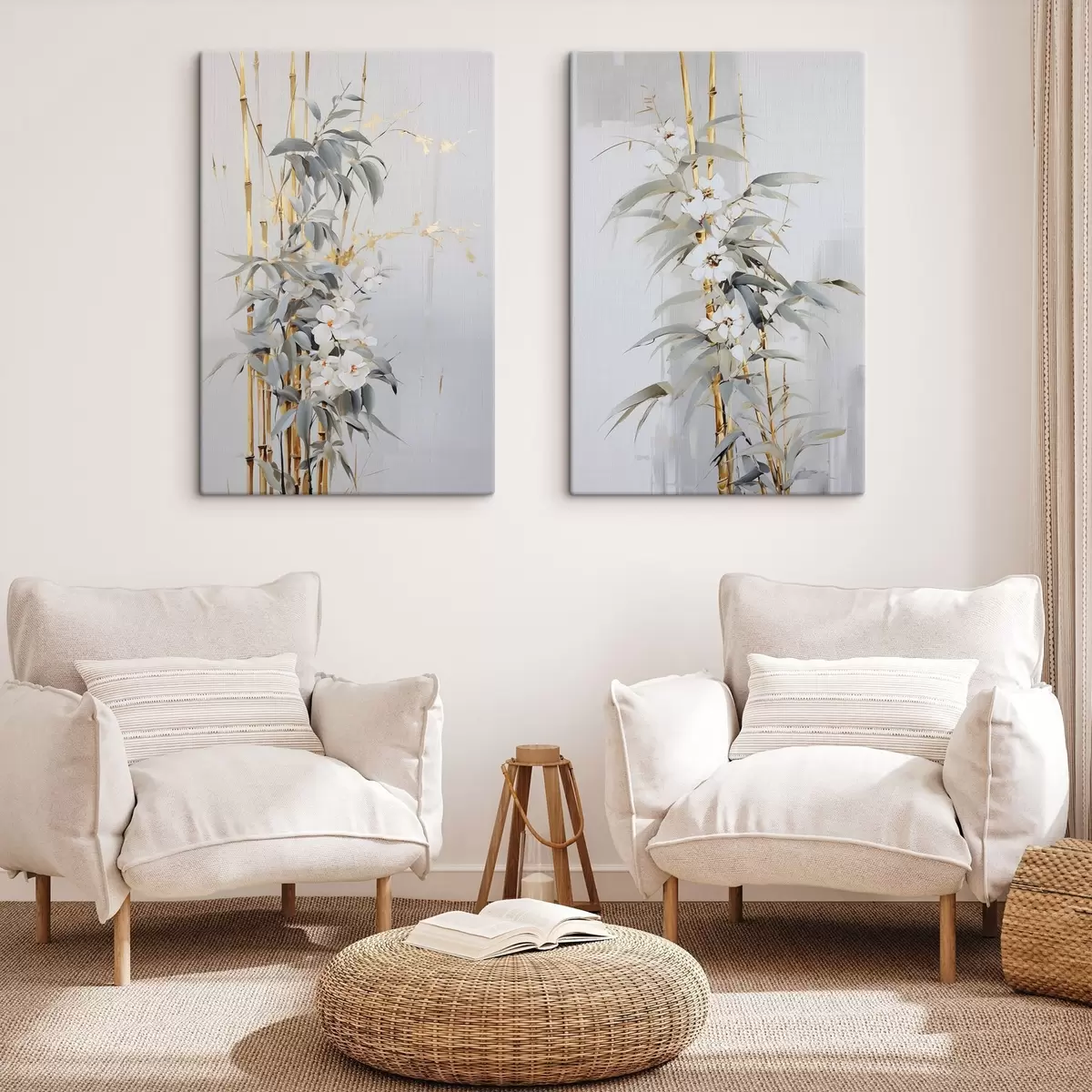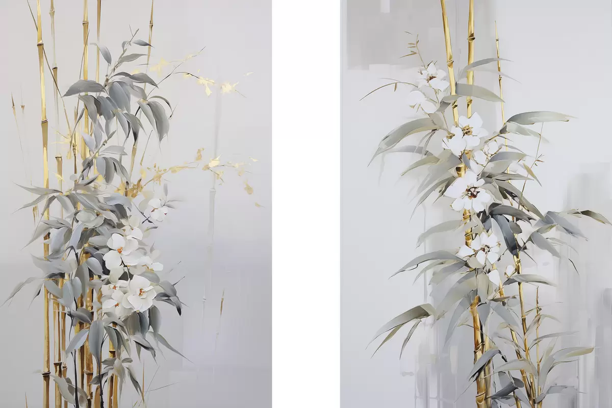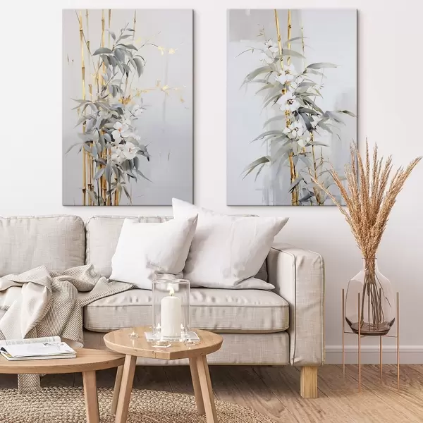 Schilderij Abstracte bamboestengels met gele accenten, delicate witte bloemen en lichtgroene bladeren, grijze achtergrond Art. m01127