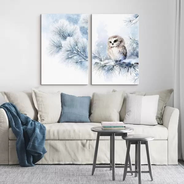 Schilderij schattige uil op een met sneeuw bedekte dennenboomtak in aquarelstijl Art. m01168
