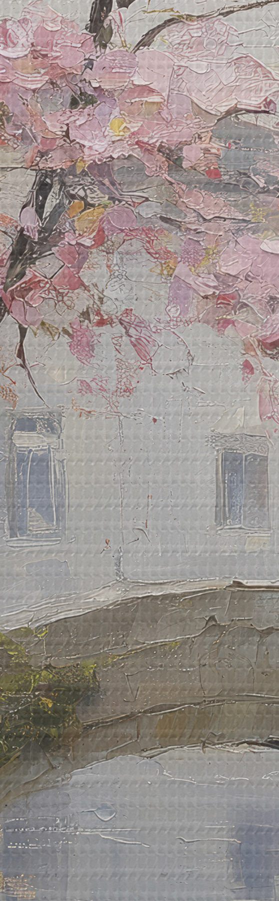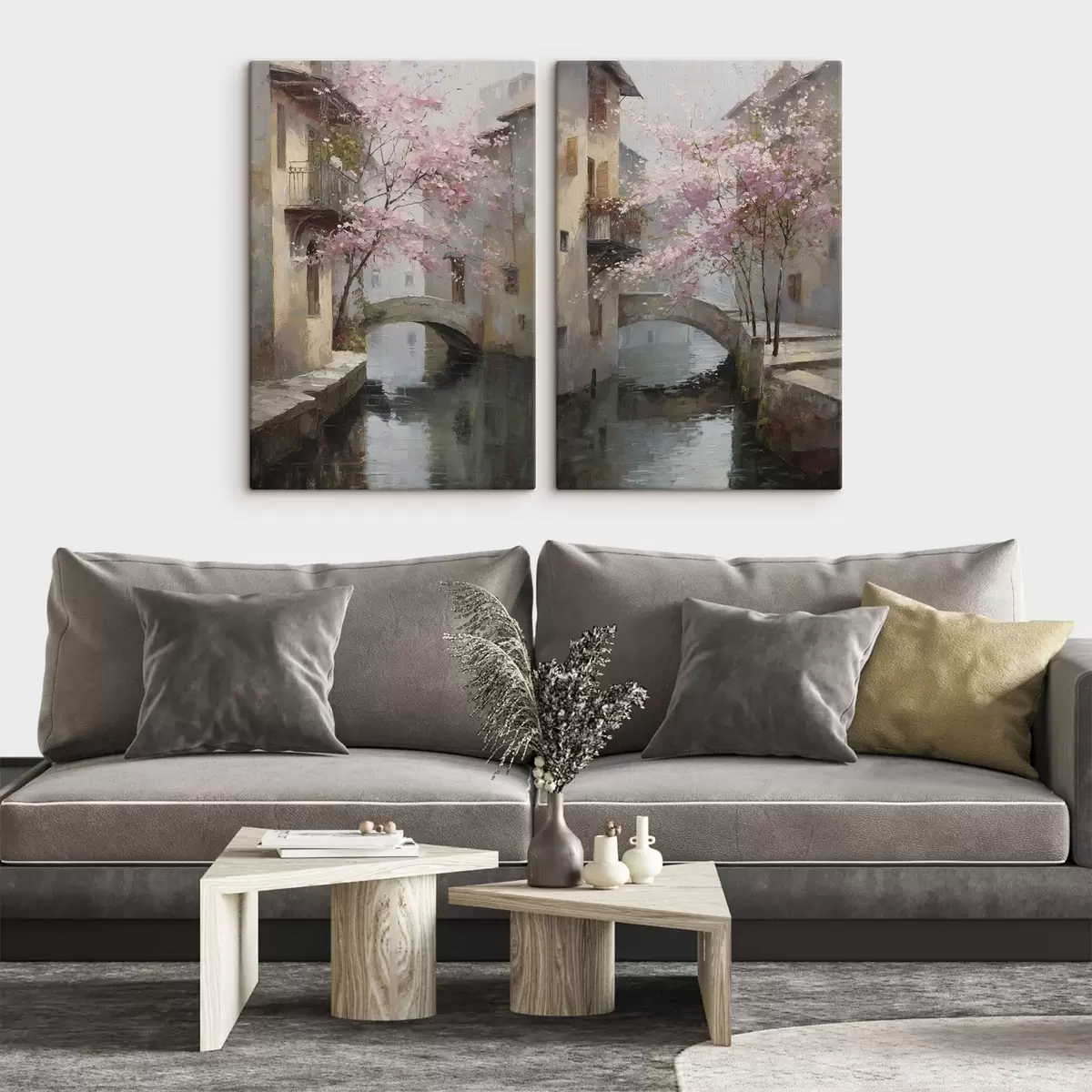 Schilderij romantisch stadsgezicht met een bloeiende boom in de stijl van een olieverfschilderij Art. m01173
