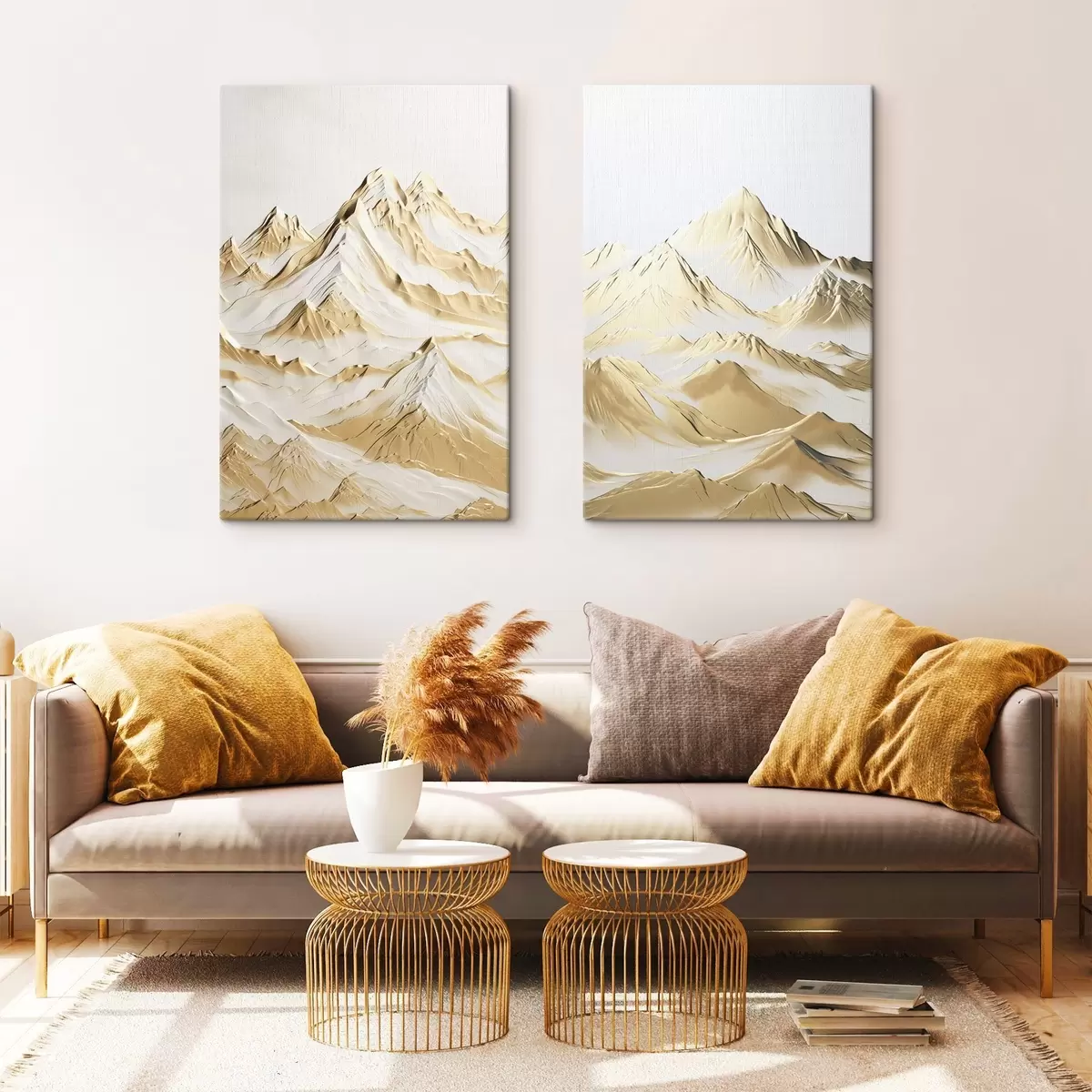 Schilderijen Een landschap van gele, met sneeuw bedekte bergen met scherpe toppen en diepe valleien onder een heldere hemel. m01236