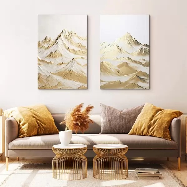 Schilderij Een landschap van gele, met sneeuw bedekte bergen met scherpe toppen en diepe valleien onder een heldere hemel. Art. m01236