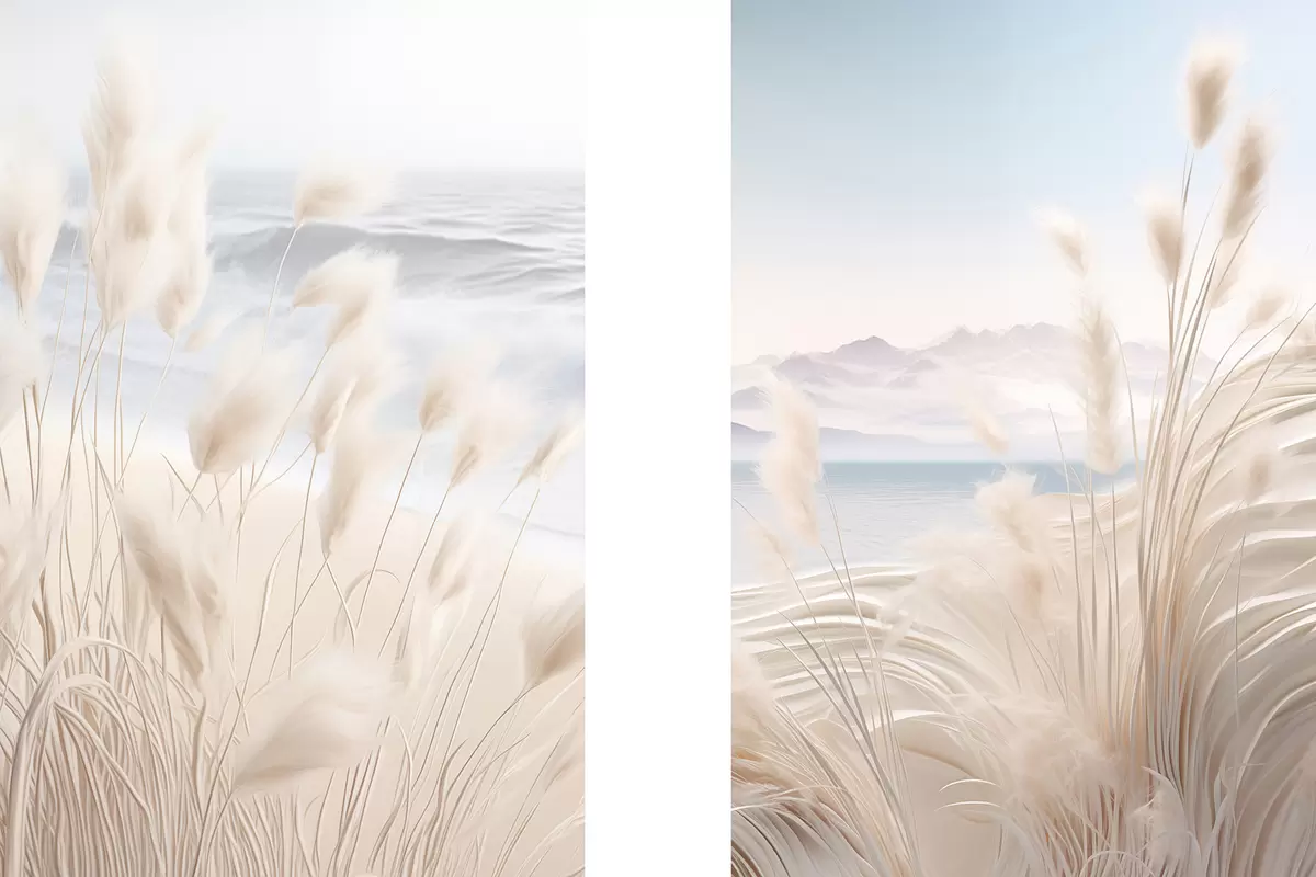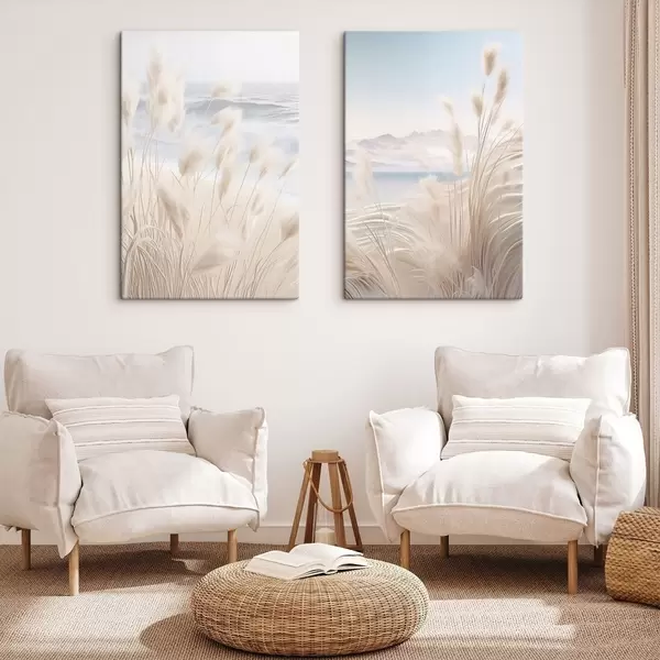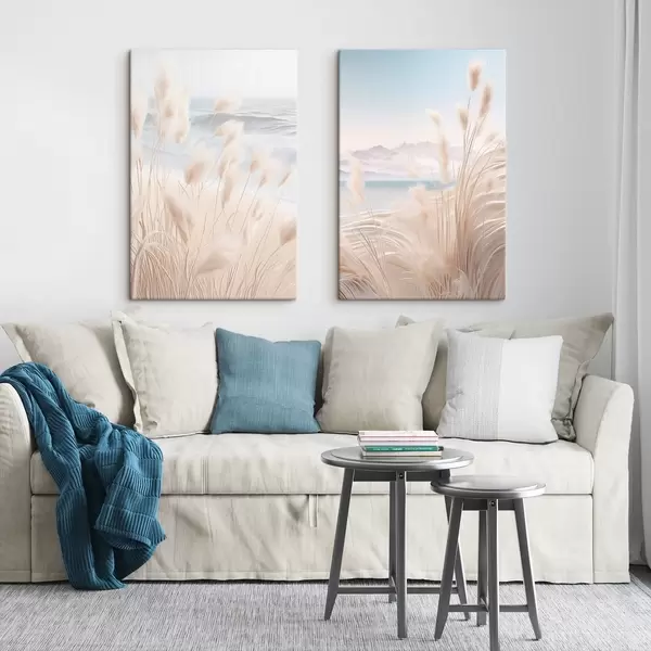 Schilderijen Hoog, vederachtig pampagras in zachte beige tinten op de voorgrond, met een zandstrand op de achtergrond m01242