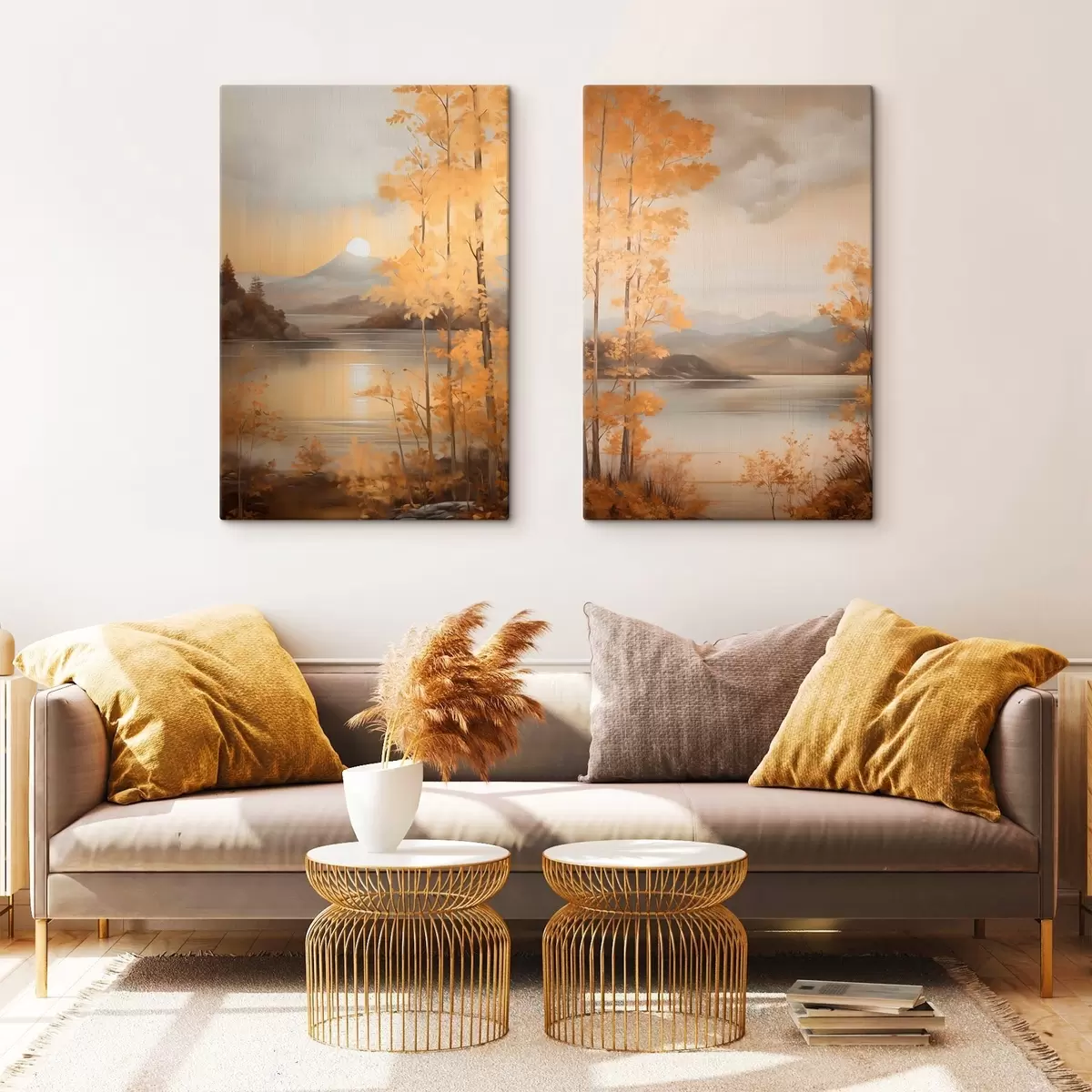 Schilderij Herfstbomen met oranje bladeren omlijsten een rustig meer met bergen in de verte onder een bewolkte hemel. Art. m01246