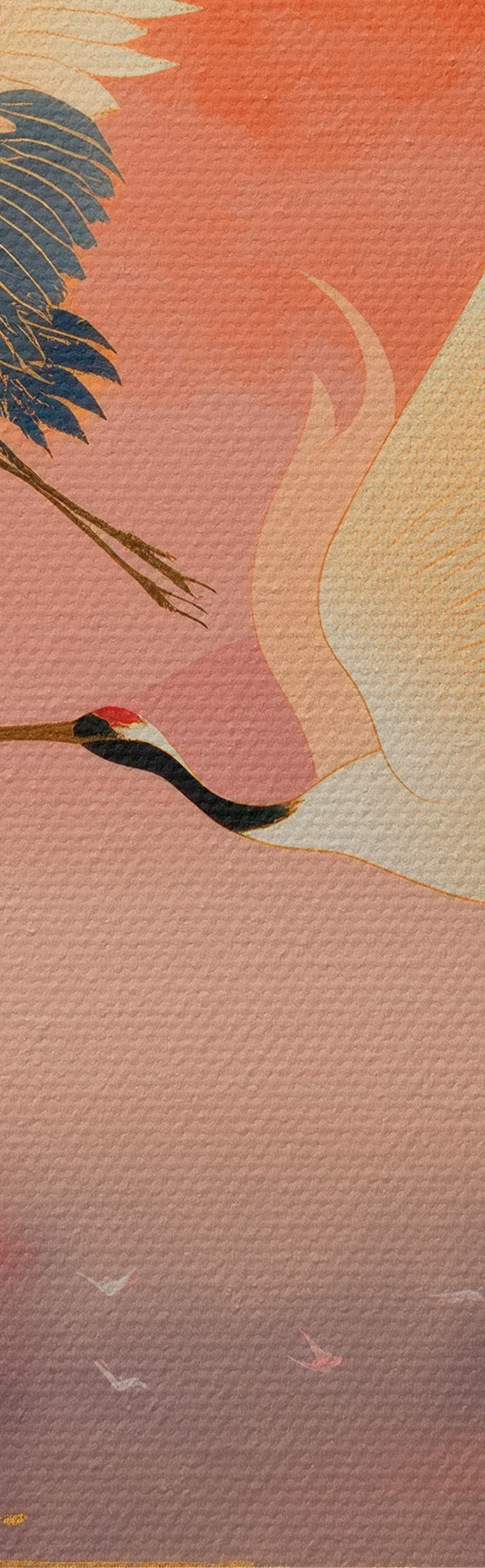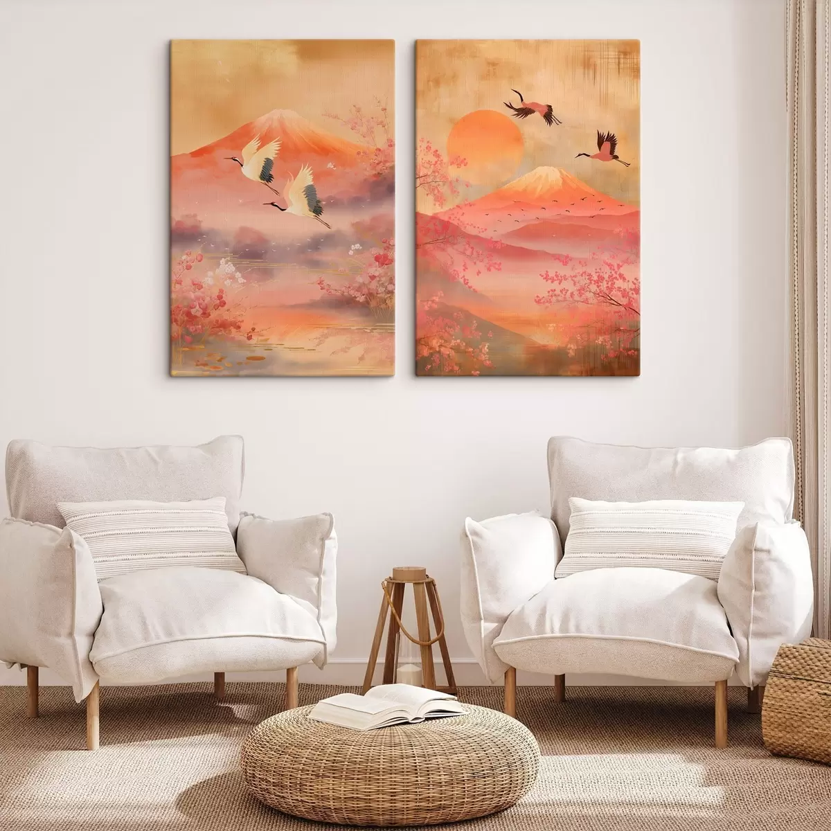 Schilderij Japans landschap met kraanvogels en de berg Fuji in een klassieke illustratiestijl Art. m30042