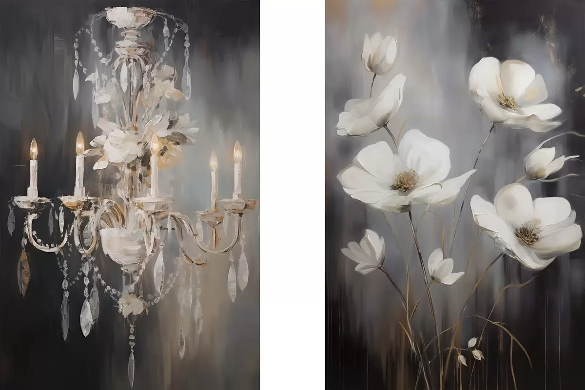 Schilderij Abstracte sierlijke kroonluchter met brandende kaarsen en bloemenkunst, tegen een donkere, gestructureerde achtergrond Art. m30049