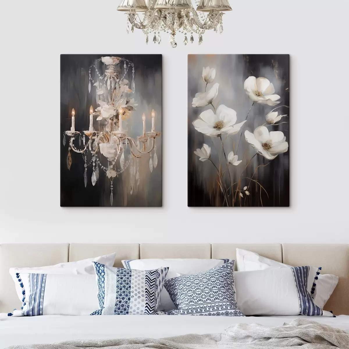 Schilderijen Abstracte sierlijke kroonluchter met brandende kaarsen en bloemenkunst, tegen een donkere, gestructureerde achtergrond m30049