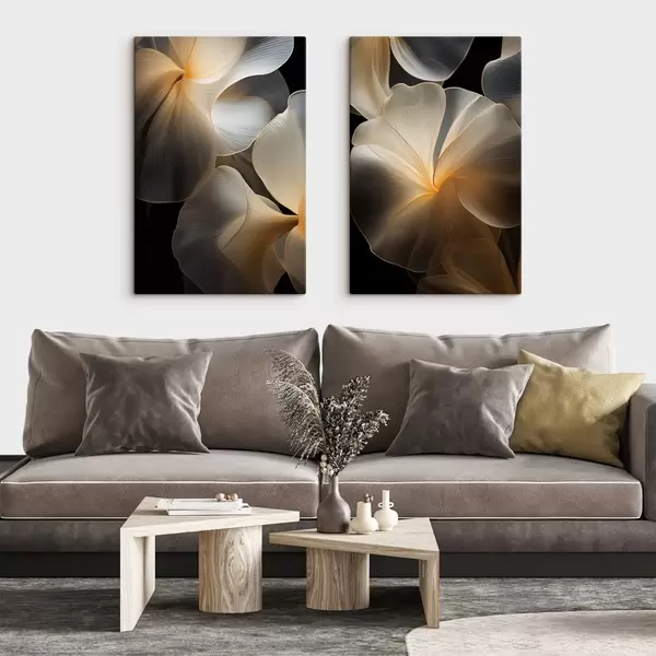 Schilderij Abstracte, vloeiende, doorschijnende bloemblaadjes met delicate lijnen, tegen een donkere achtergrond Art. m30050