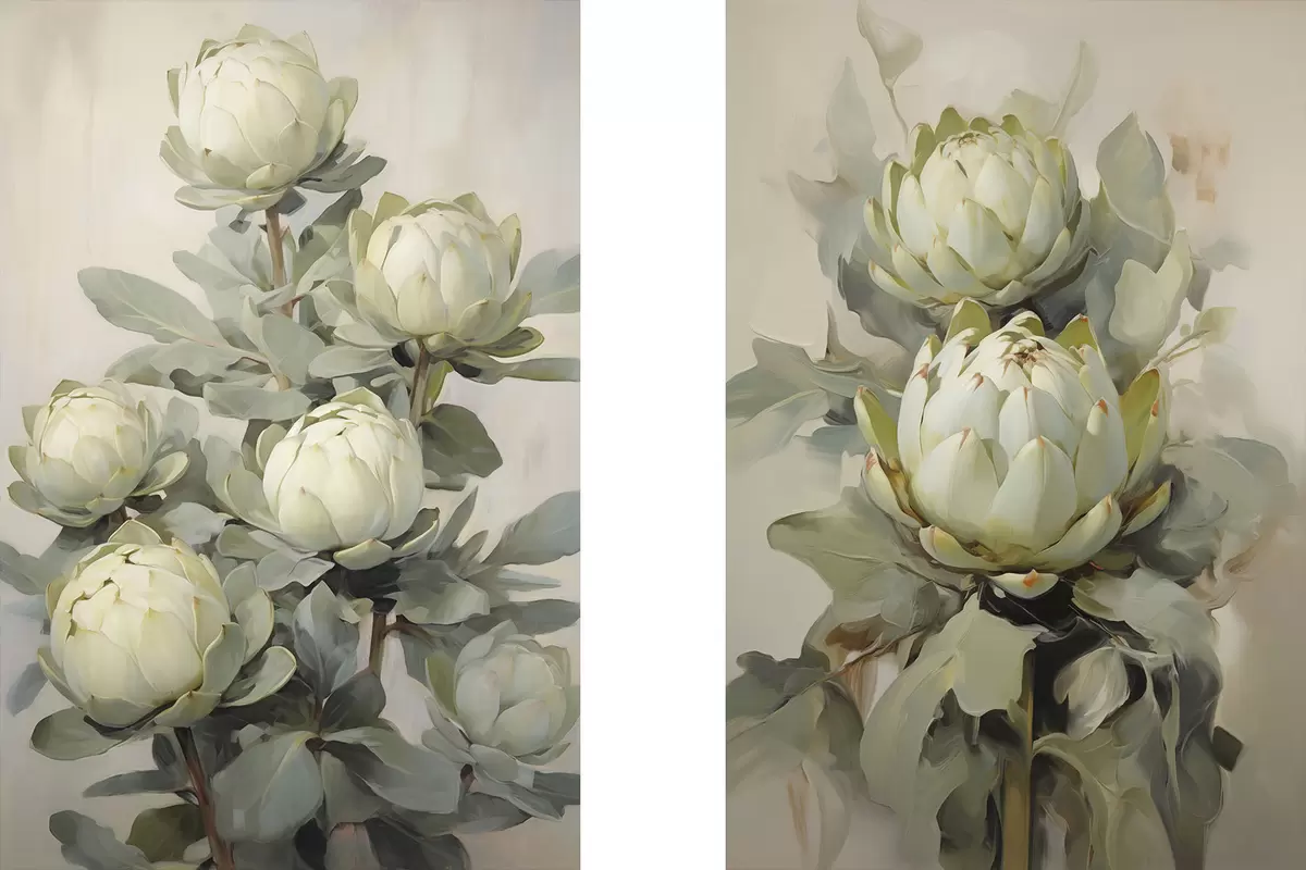 Schilderij Schilderstijl van verschillende witte proteabloemen met grote groene bladeren tegen een lichte achtergrond Art. m30051