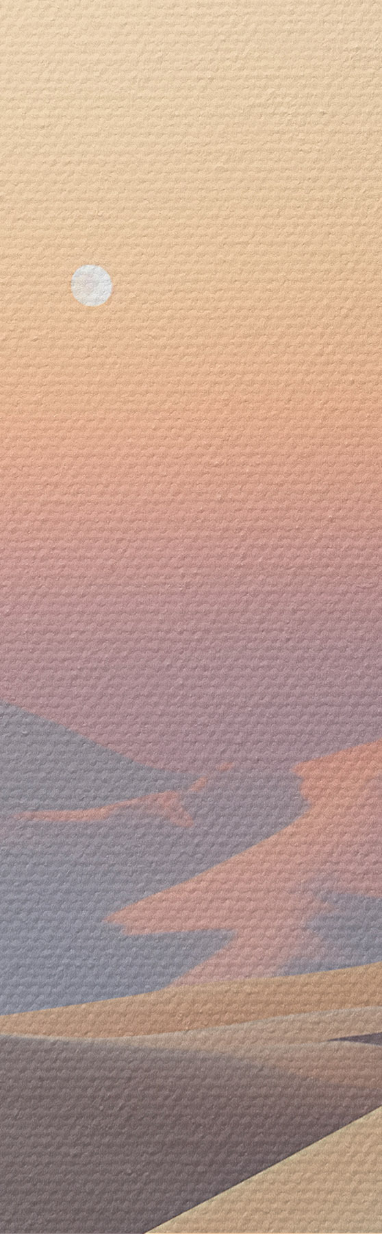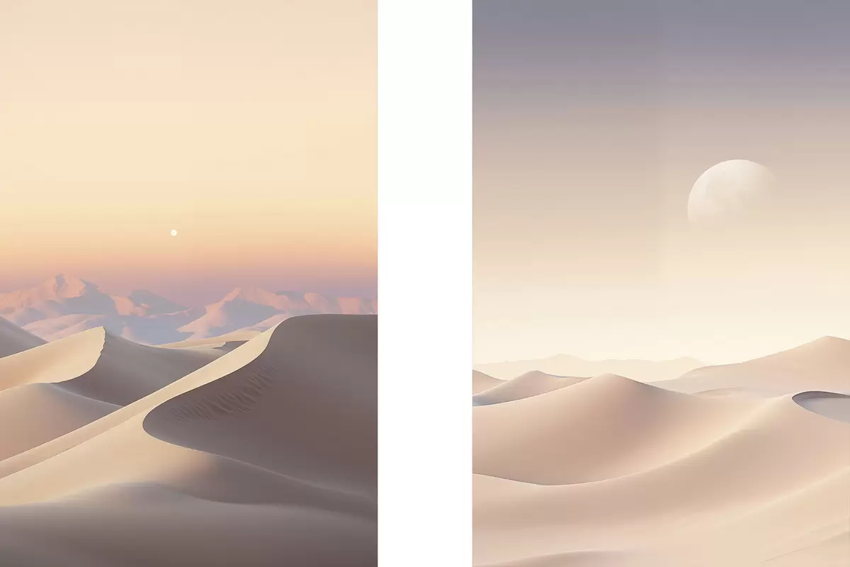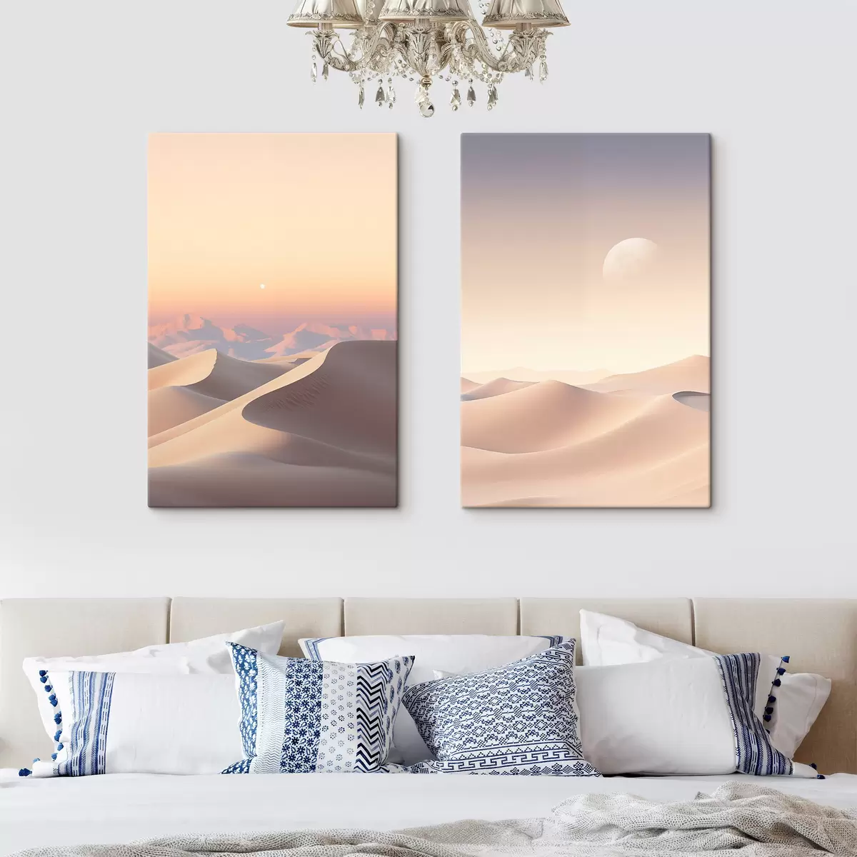 Schilderij Een woestijnlandschap met glooiende zandduinen onder een zachte pastelkleurige lucht, met in de verte bergen op de achtergrond. Art. m30053