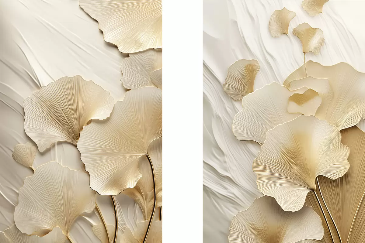 Schilderij Ginkgo-bladeren tegen een gestructureerde, lichte achtergrond, elegante en abstracte compositie Art. m30054