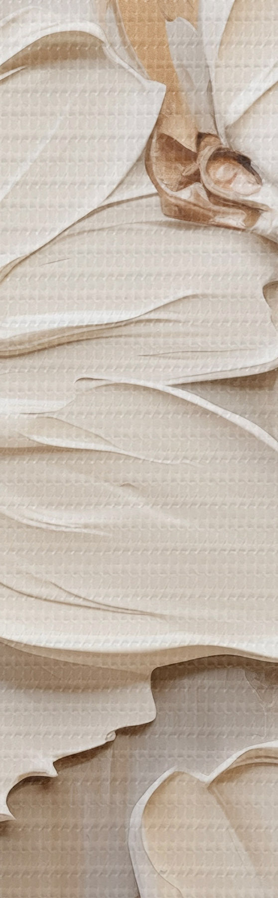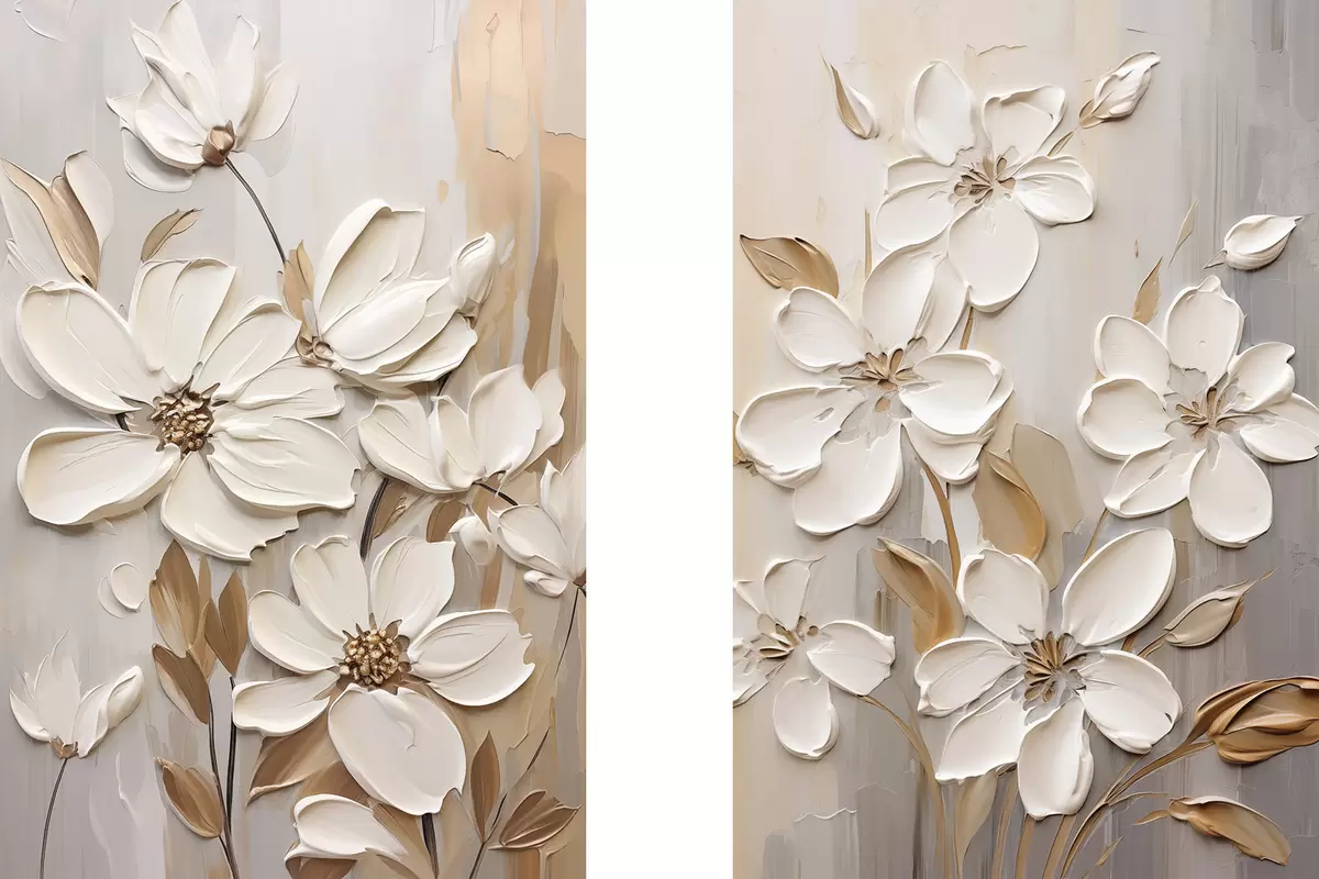 Schilderij Abstracte witte bloemen met gestructureerde bloemblaadjes, tegen een neutrale achtergrond met subtiele penseelstreken. imitatie Art. m30057