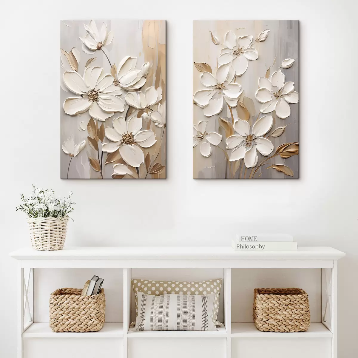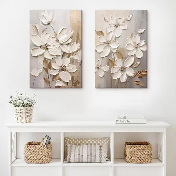 Schilderijen Abstracte witte bloemen met gestructureerde bloemblaadjes, tegen een neutrale achtergrond met subtiele penseelstreken. imitatie m30057