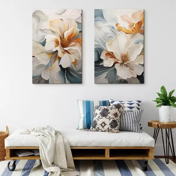Schilderijen Abstracte grote bloem met witte, oranje en blauwgroene bloemblaadjes, gestructureerde achtergrond m30059