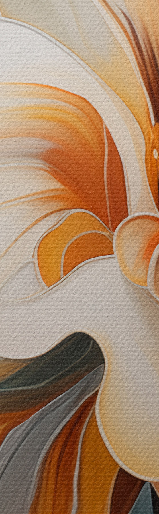 Schilderij Abstracte grote bloem met witte, oranje en blauwgroene bloemblaadjes, gestructureerde achtergrond Art. m30059