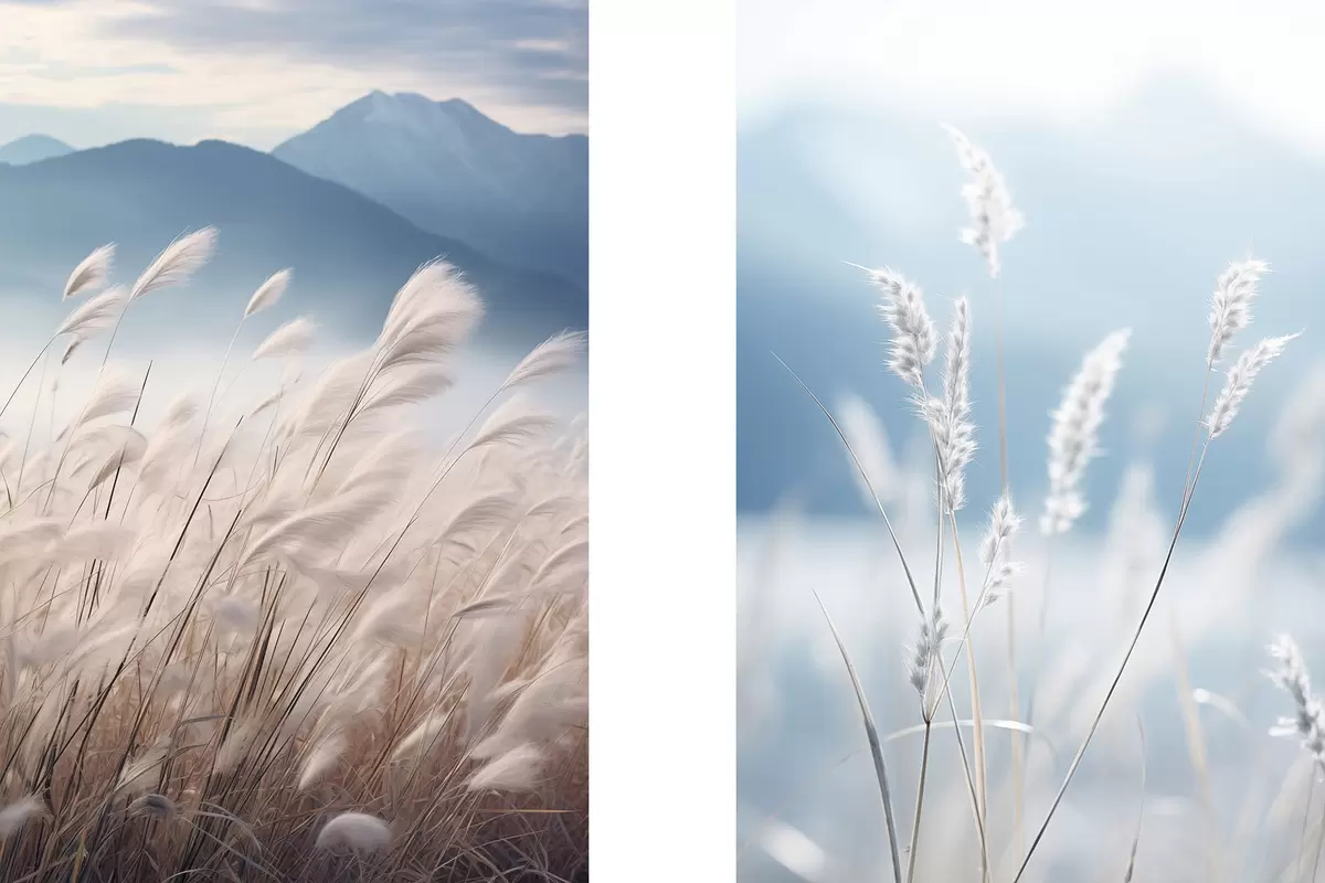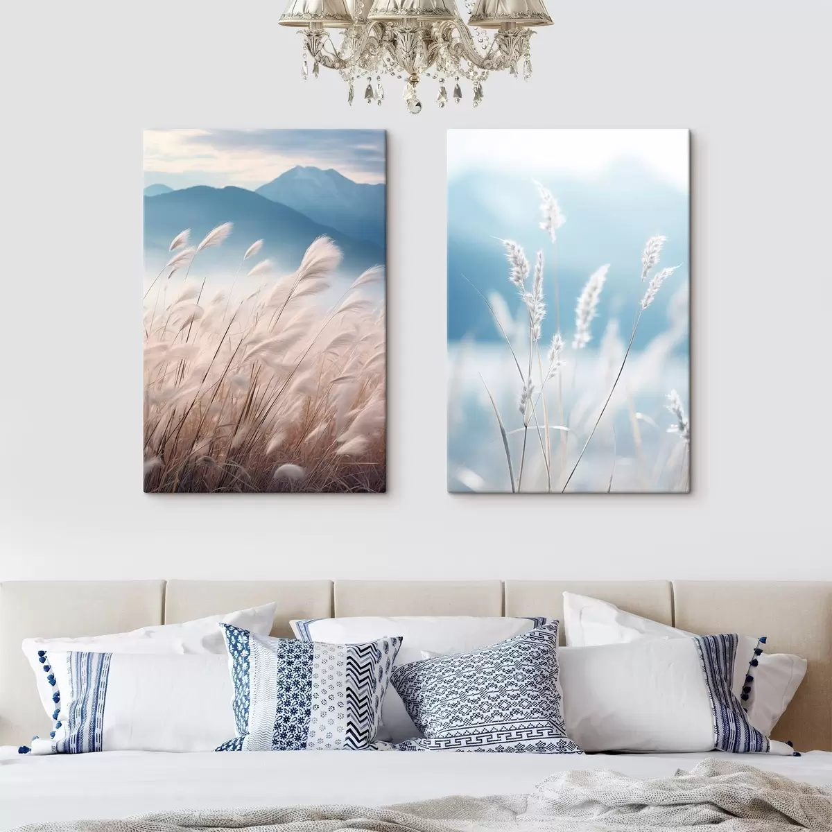 Schilderij Hoog, wit pampagras dat in de wind wappert met zachte blauwe bergen op de achtergrond Art. m30060