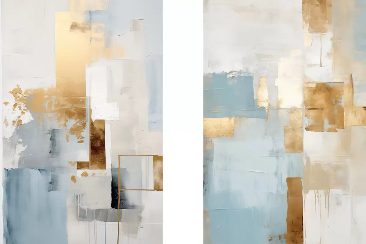 Schilderij Abstracte geometrische vormen in geel, blauw en wit, met textuur en een minimalistische compositie. Art. m30061