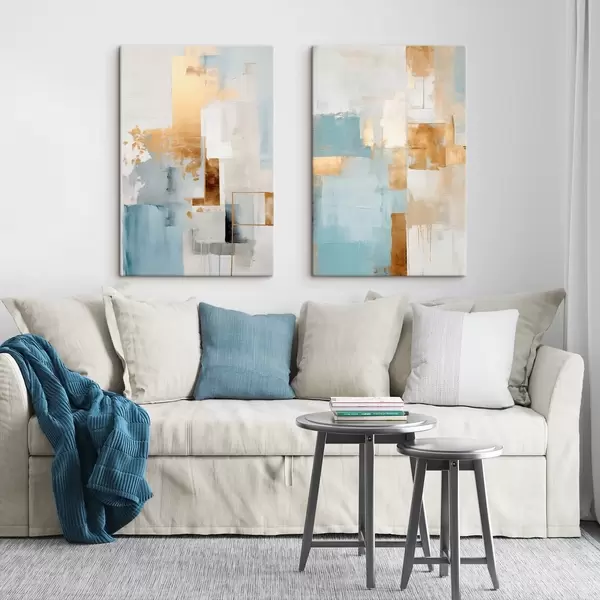 Schilderijen Abstracte geometrische vormen in geel, blauw en wit, met textuur en een minimalistische compositie. m30061