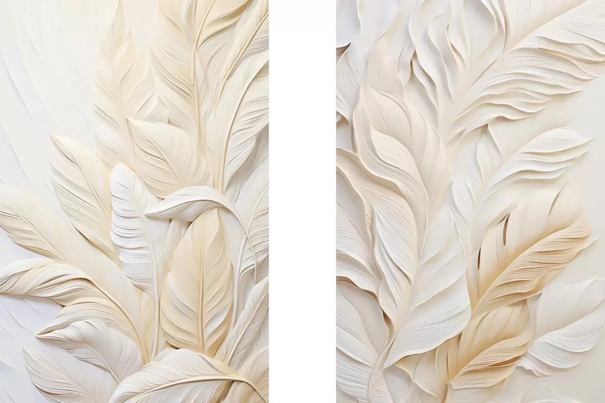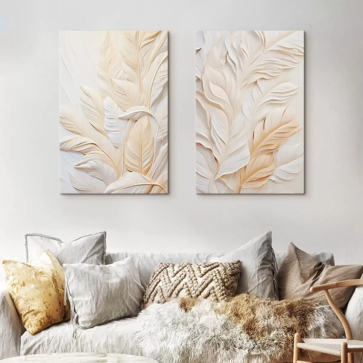 Schilderijen Crèmekleurige veren die elkaar overlappen, met een zachte, lichte achtergrond m30062