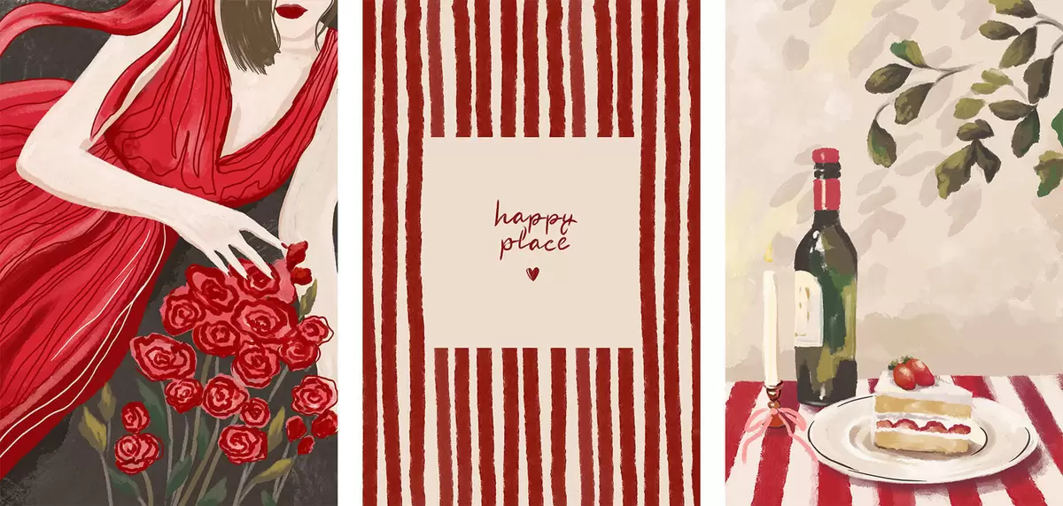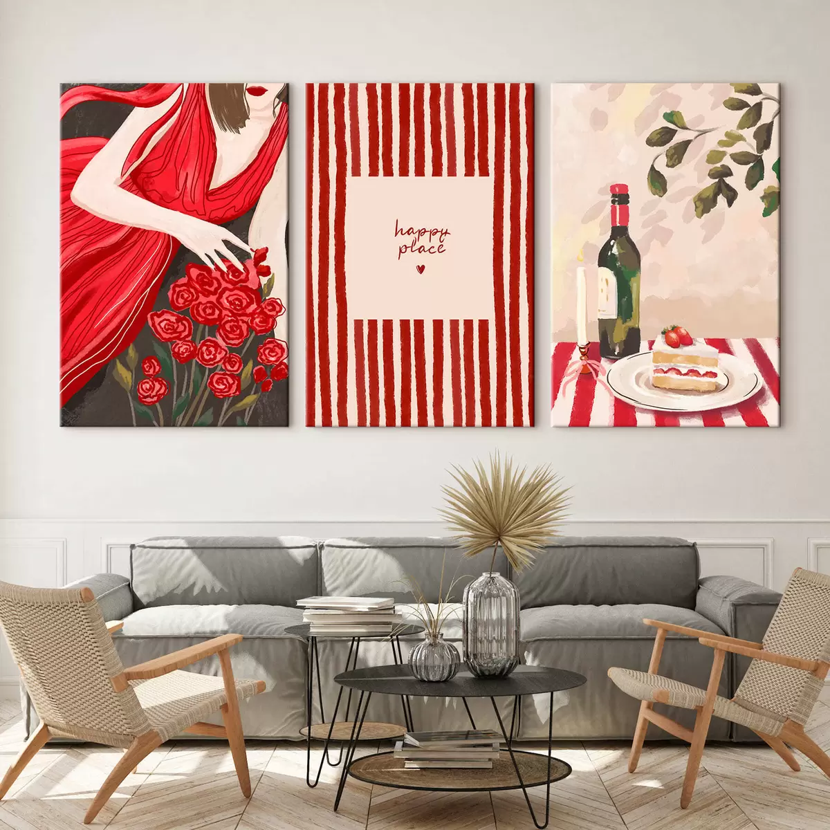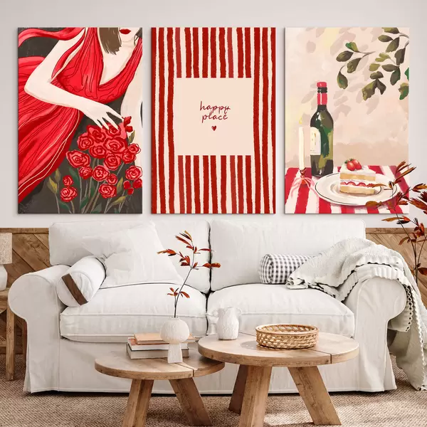 Schilderij Vrouw met rozen, gestreepte poster en tafel Art. m30099