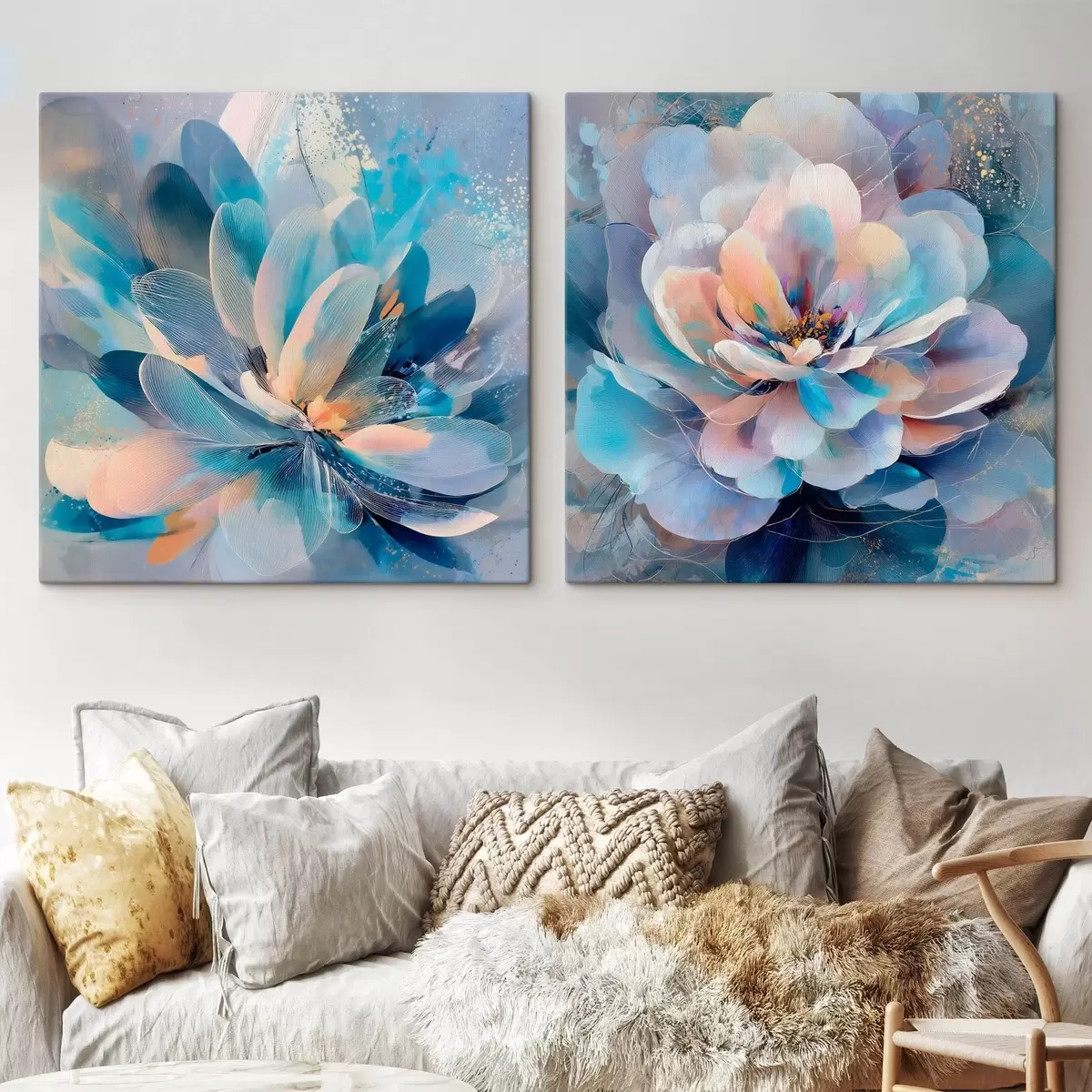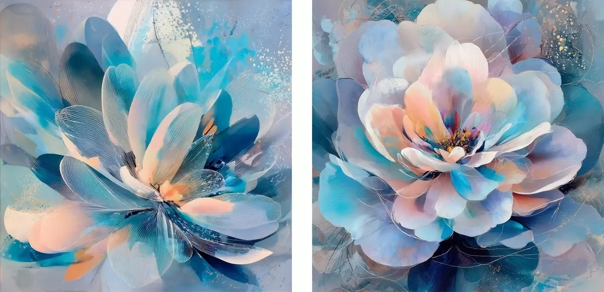 Schilderij Verfijnde pioenrozen met blauwe bloemblaadjes Art. m30147