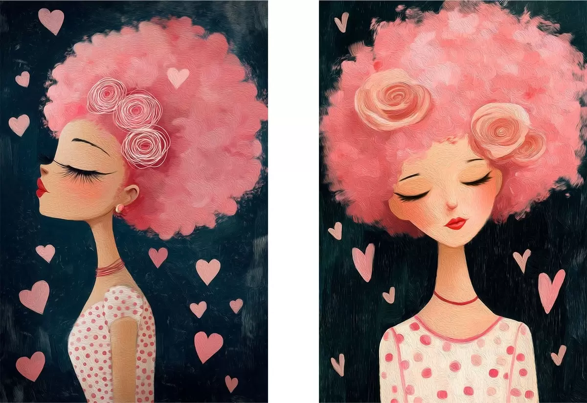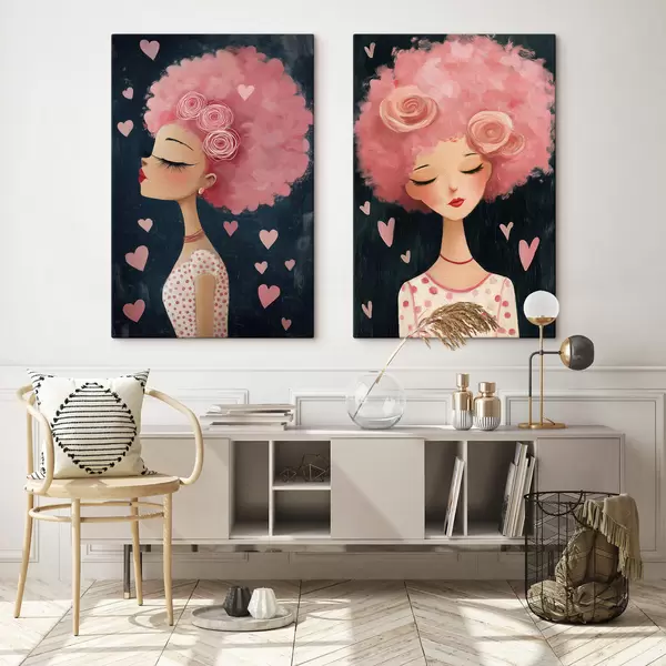 Schilderij Meisje met roze haar en hartjes Art. m30156