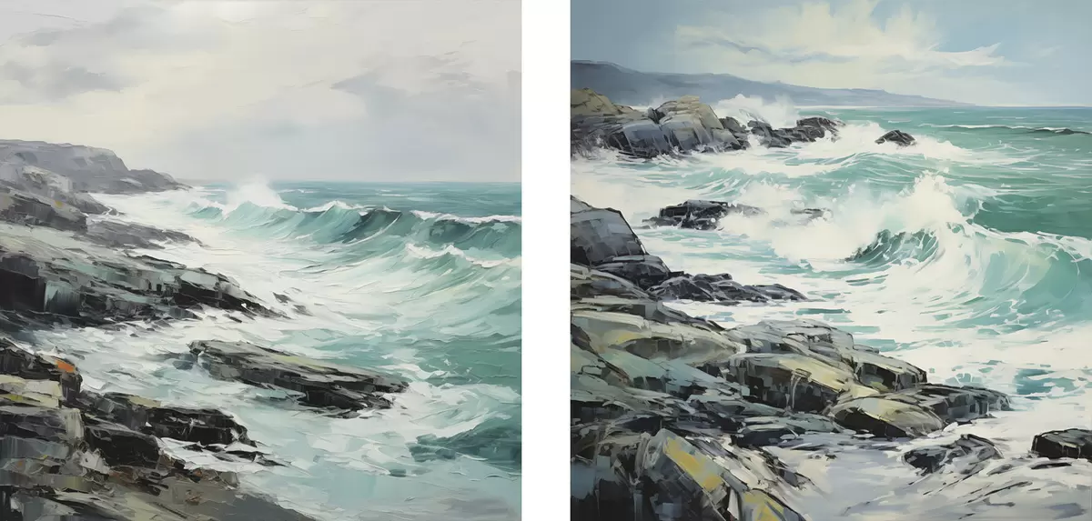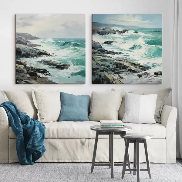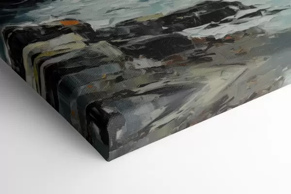 Schilderij Een rotsachtig kustlandschap met golven onder een bewolkte hemel, in schilderijstijl Art. m30198