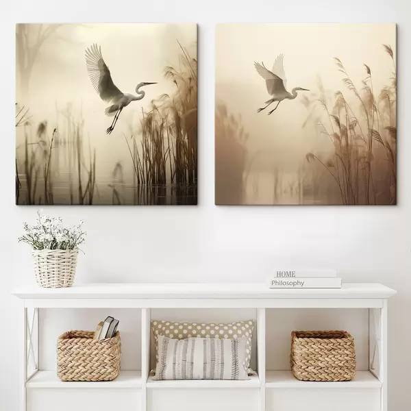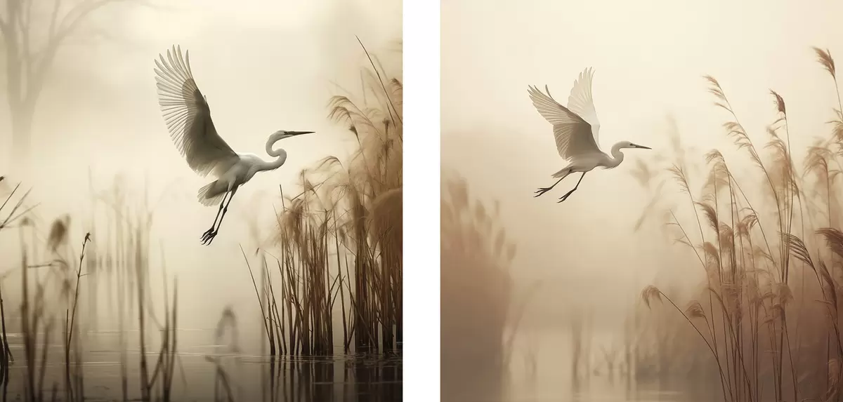 Schilderij Een witte reiger vliegt over een meer, omringd door hoog riet en bomen op de achtergrond Art. m30199