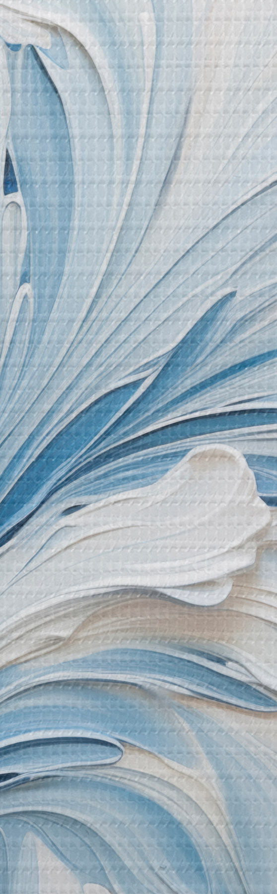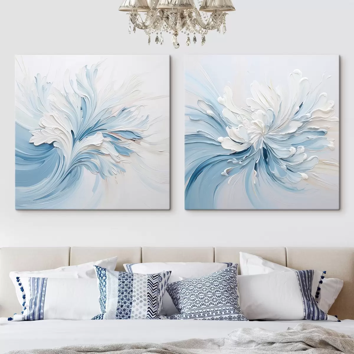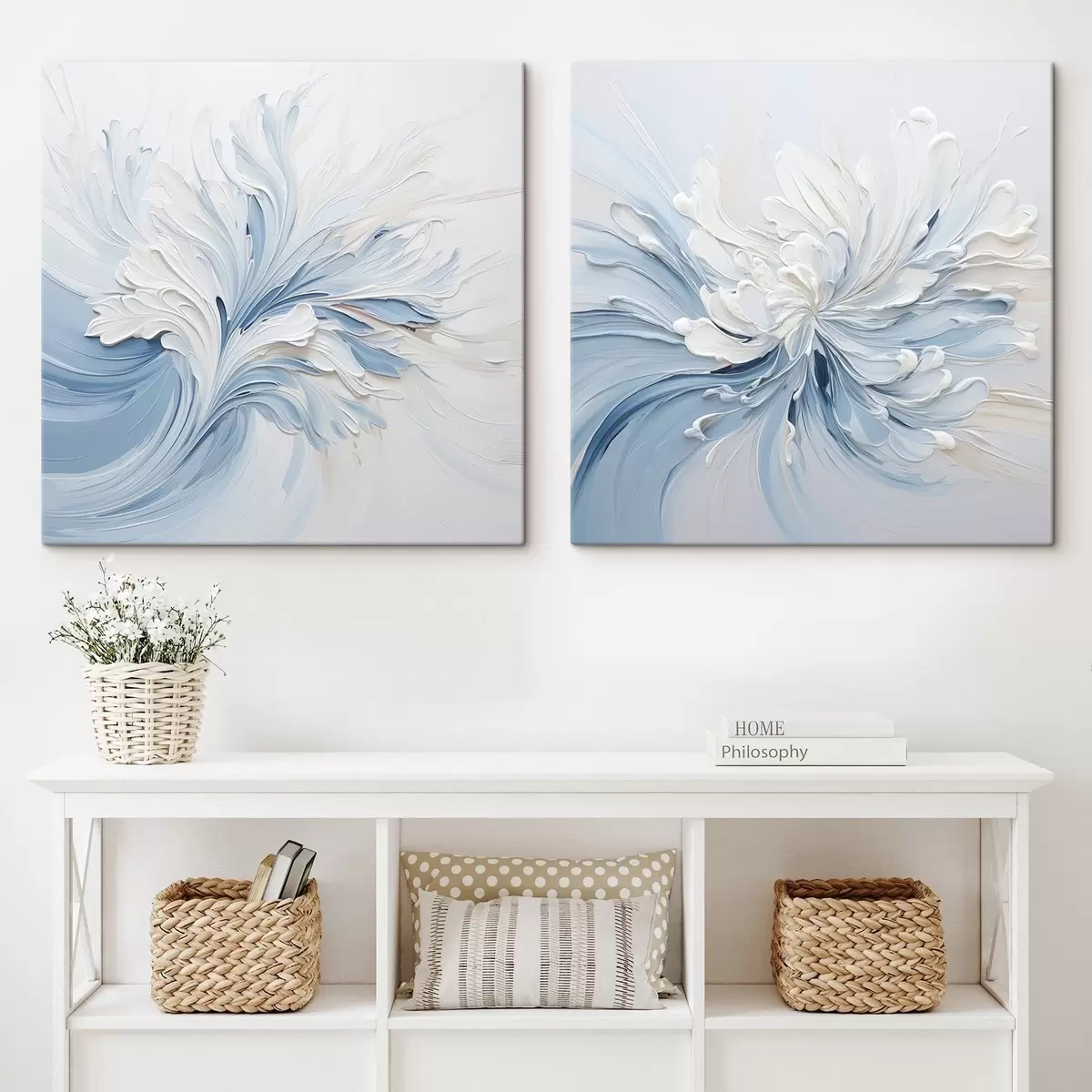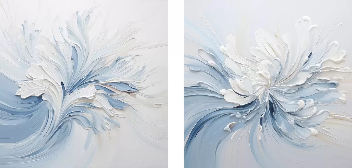 Schilderij Een abstract bloemmotief in wit en lichtblauw met bloemblaadjes met textuur en wervelende lijnen Art. m30202