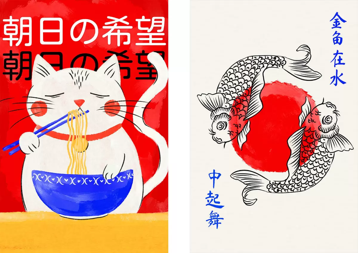 Schilderijen Tweeluik met een vrouwenportret en decoratieve vissen m30234