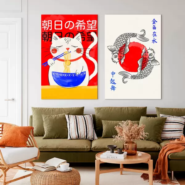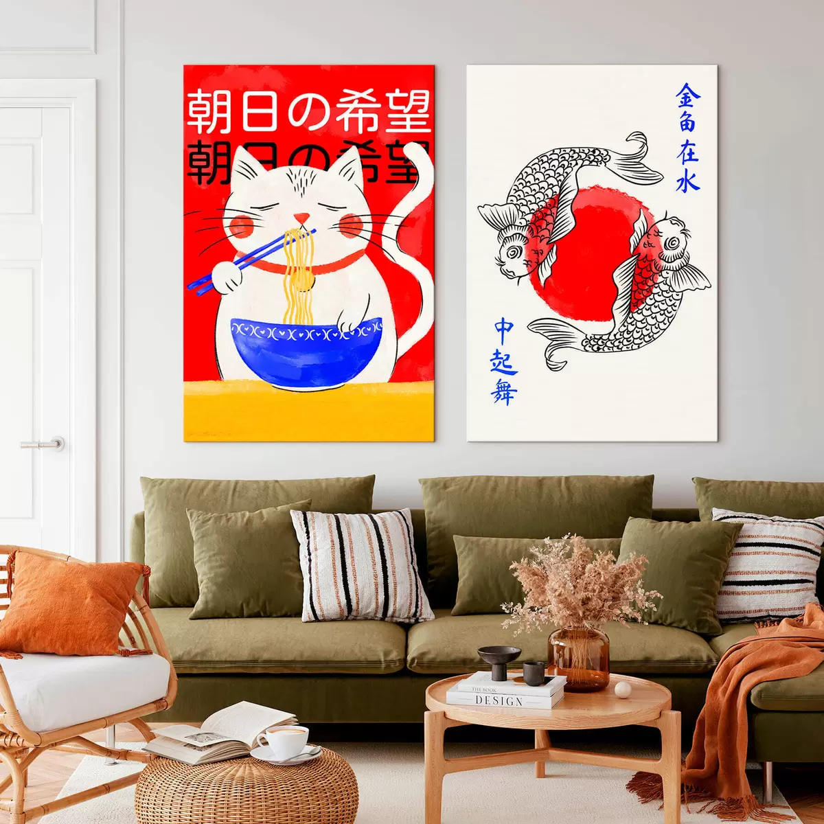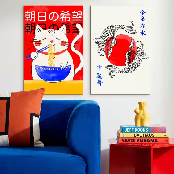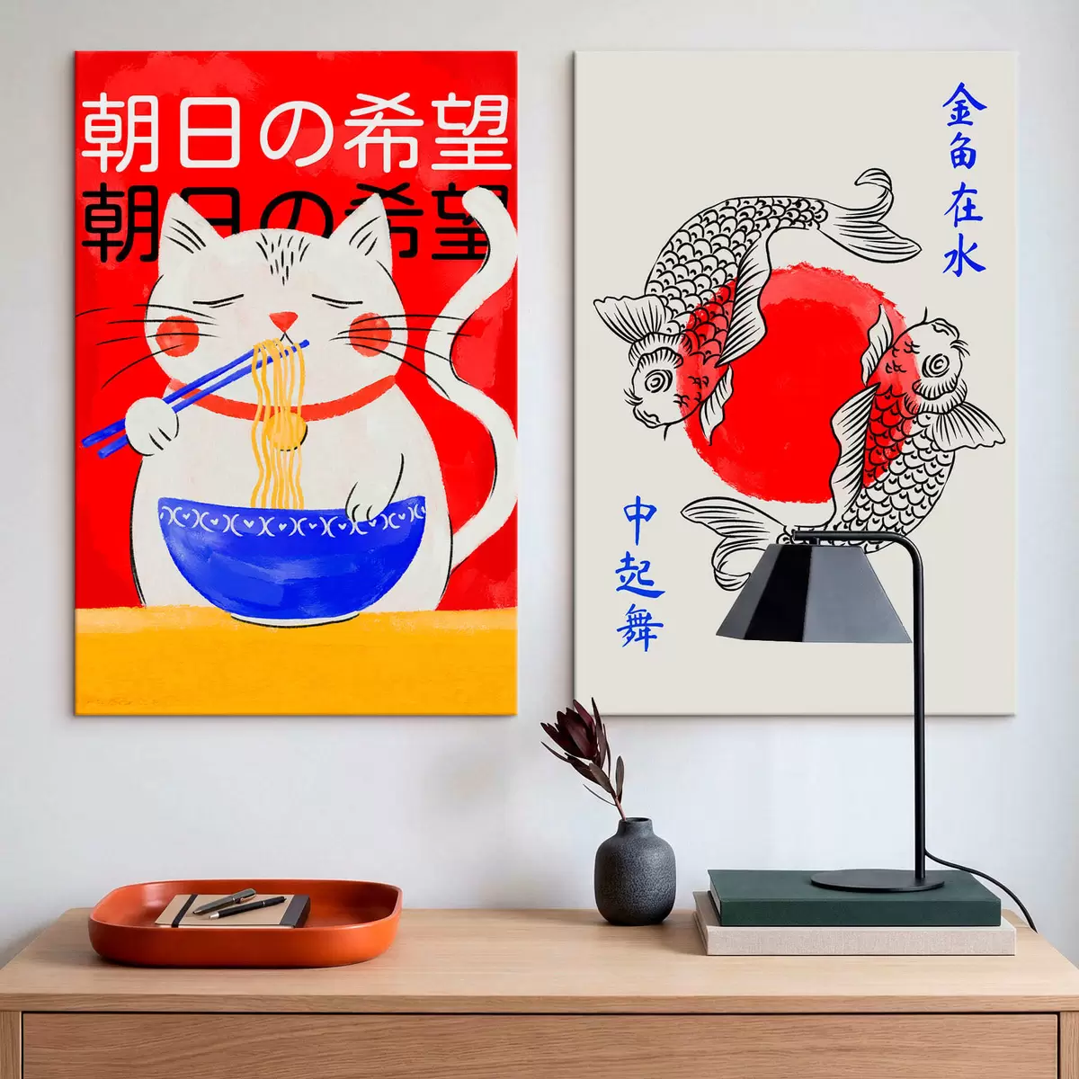 Schilderij Tweeluik met een vrouwenportret en decoratieve vissen Art. m30234