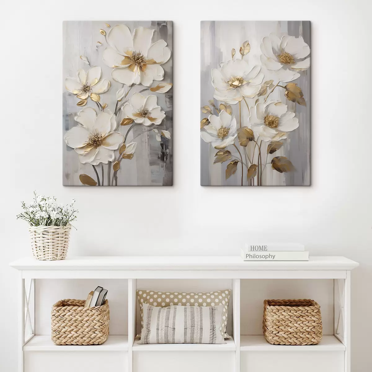 Schilderijen Witte bloemen met gele accenten op een structuurrijke achtergrond m30311