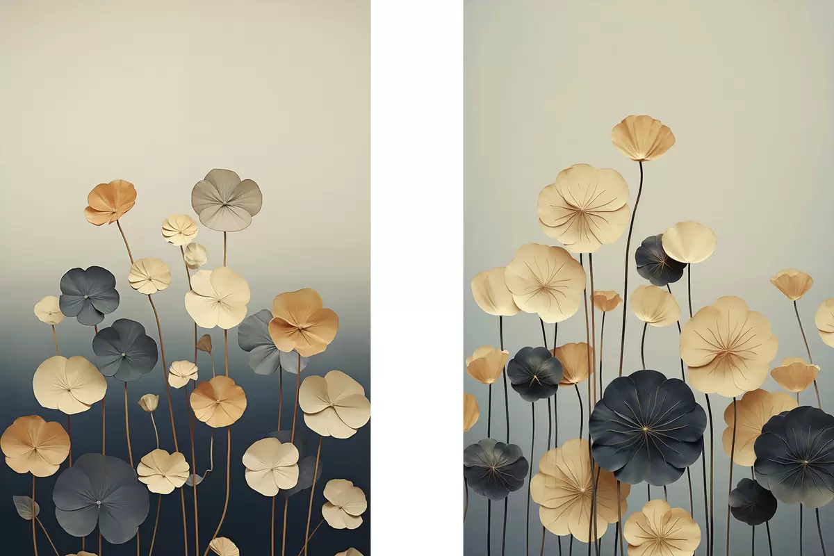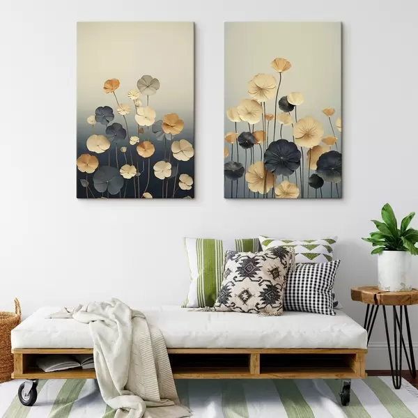 Schilderijen Waterlelieblaadjes tegen een ingetogen achtergrond van beige en donkerblauw m30317
