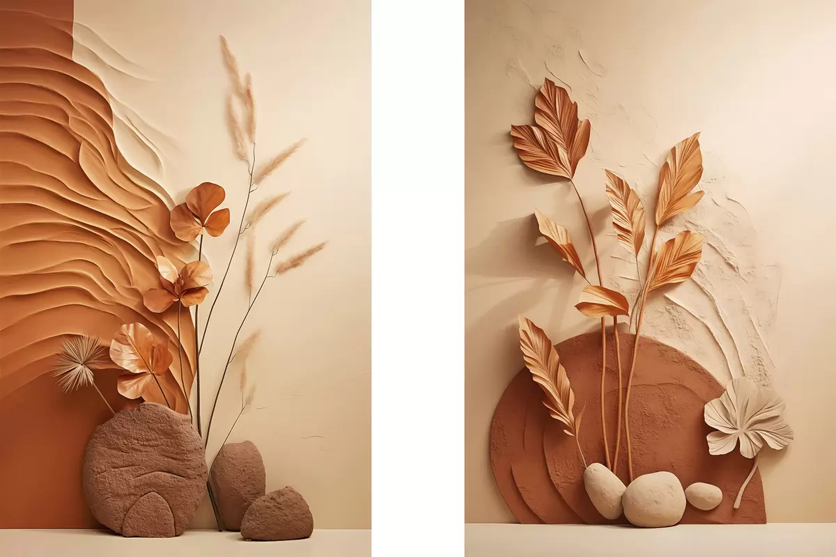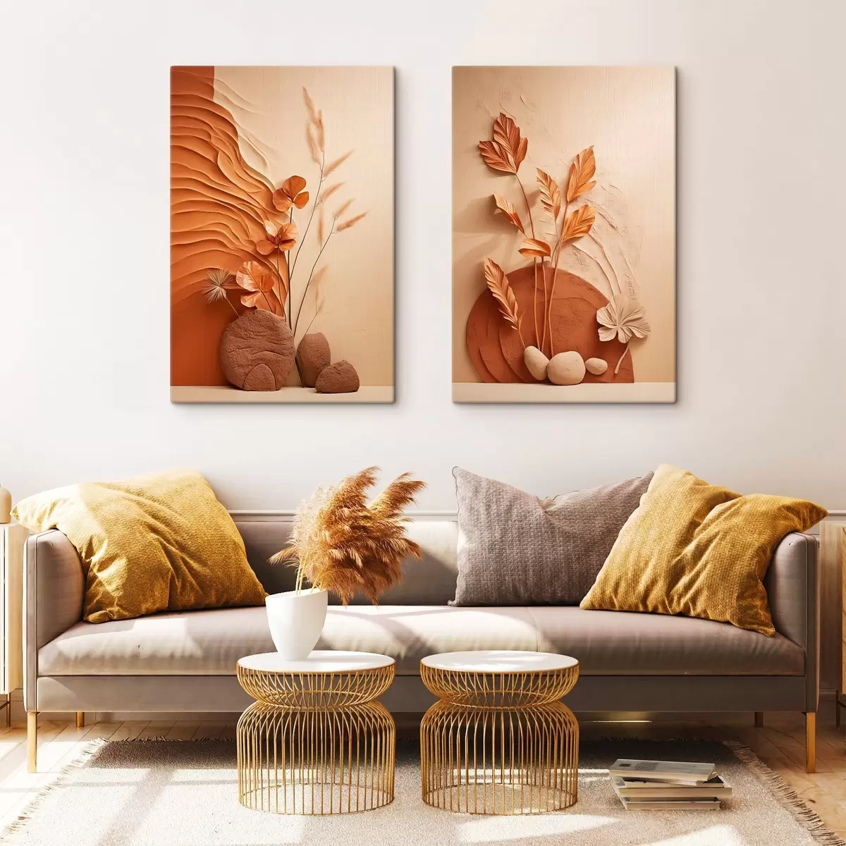 Schilderij Een minimalistisch kunstwerk met gedroogde bloemen en pampasgras, op een achtergrond met textuur Art. m30320