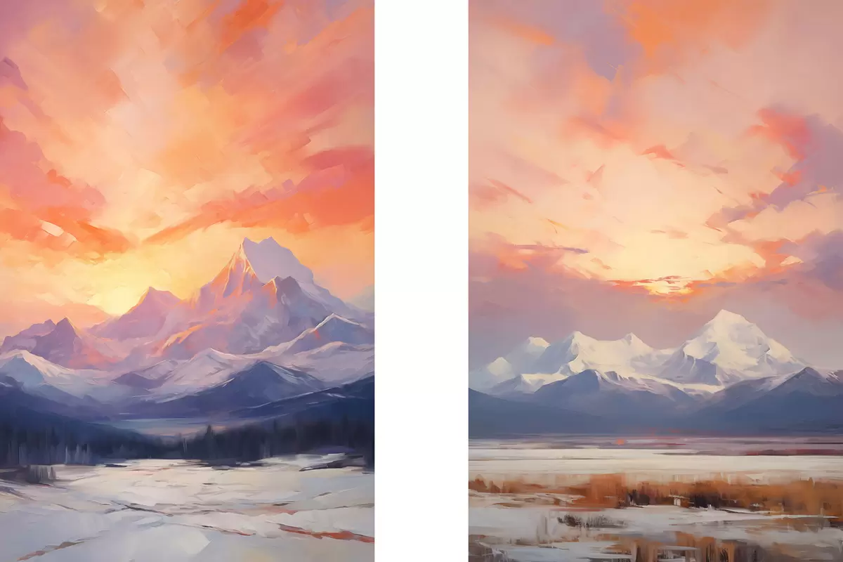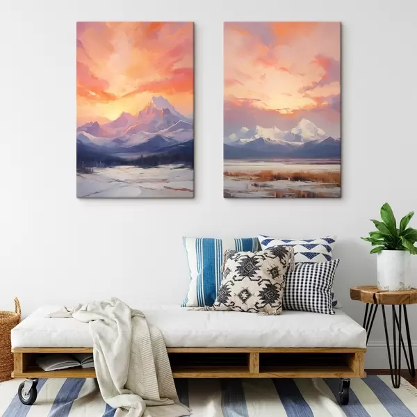 Schilderij Met sneeuw bedekte bergen onder een levendige oranje en roze lucht met wolken Art. m30321