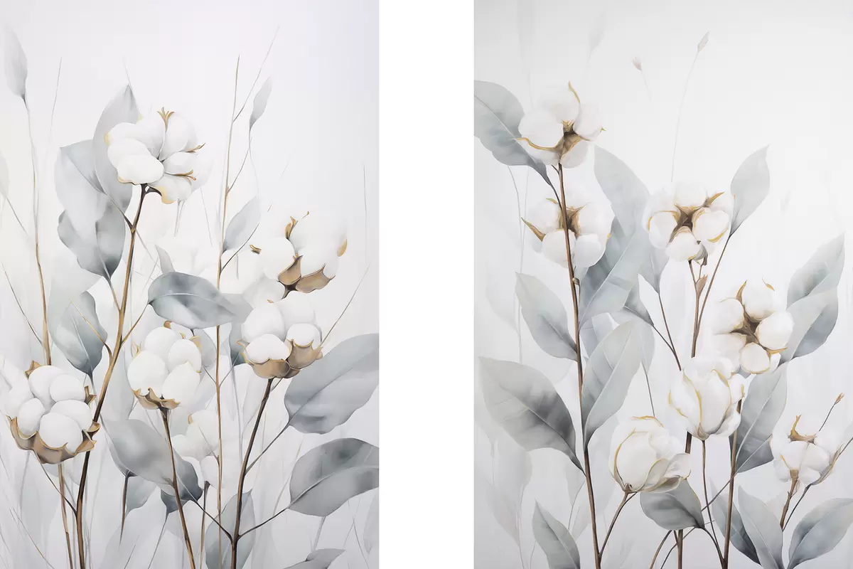 Schilderij Een witte katoenplant met lichtblauwgroene bladeren tegen een lichte achtergrond Art. m30322