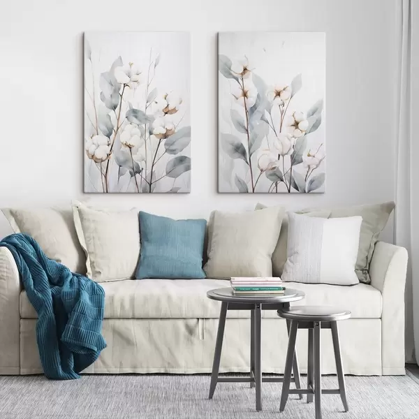 Schilderijen Een witte katoenplant met lichtblauwgroene bladeren tegen een lichte achtergrond m30322
