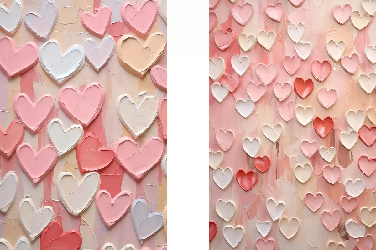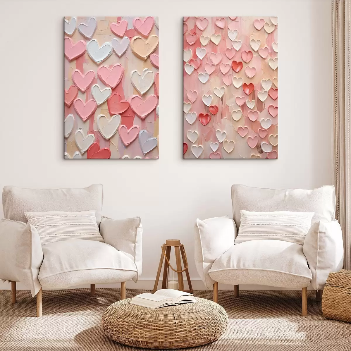 Schilderijen Hartjes in verschillende tinten perzik en roze, uitgevoerd in een gestructureerde, geschilderde stijl m30326